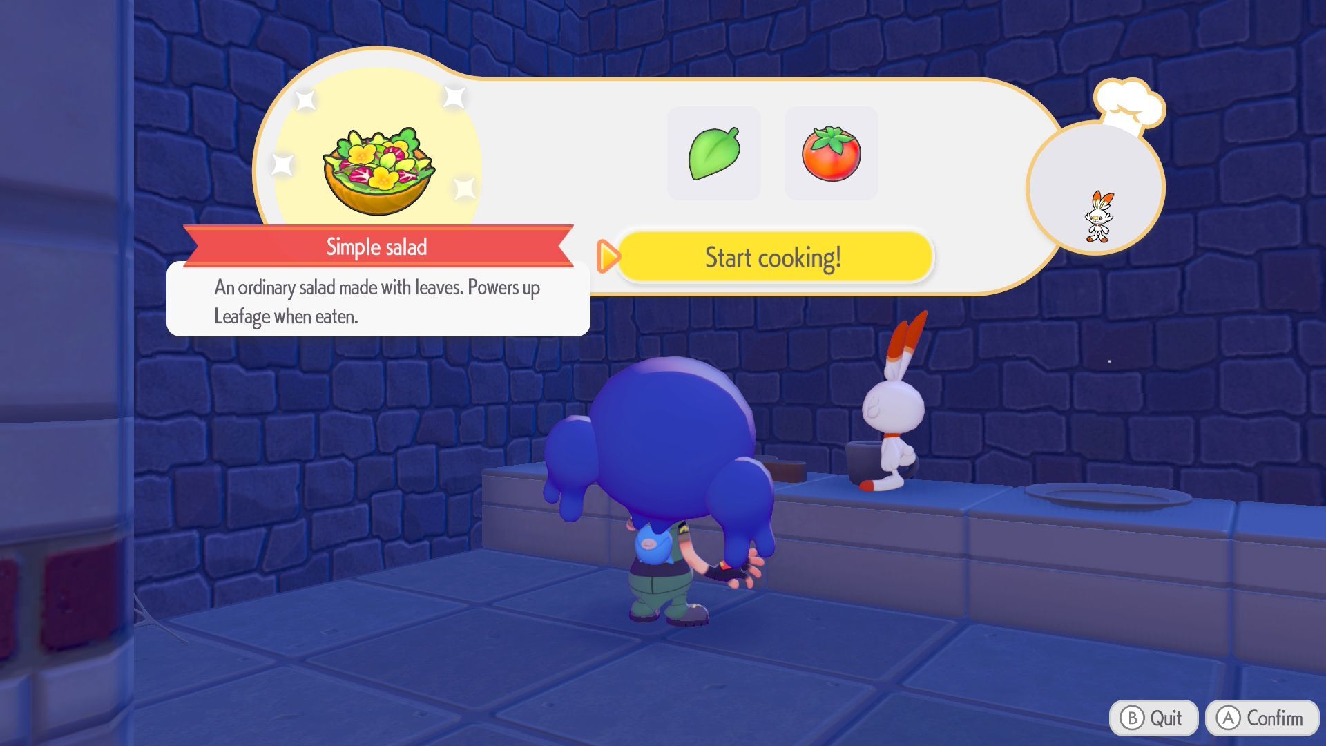 - 채 썬 샐러드: 잎사귀 1개와 다른 재료 1개를 조합해야 합니다. 다트릭스, 사이더, 시저 등 '썰기' 능력을 가진 포켓몬을 데리고 도마로 가야 합니다. 음식의 맛은 시큼합니다.