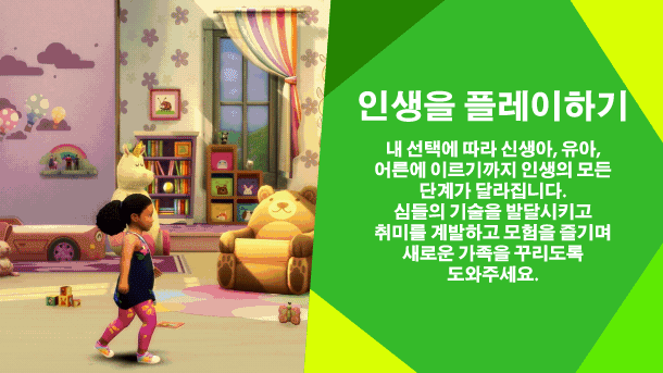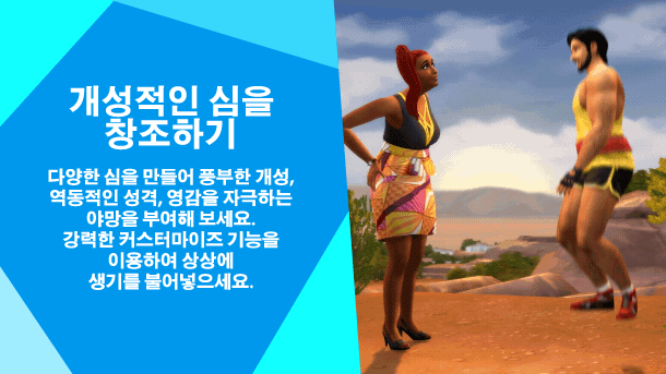 상상력을 한껏 발휘하여 개성 넘치는 심즈 세계를 창조하세요! 심들부터 건물에 이르기까지 모든 부분을 살펴보고 취향에 맞게 꾸미세요. 심들의 외모, 행동, 의상을 선택하고, 그들이 날마다 어떻게 살아갈지 결정하세요. 가족을 위해 완벽한 집을 설계해서 건설하고 좋아하는 가구와 장식물로 꾸미세요. 다른 동네에서 다른 심들을 만나고 그들의 삶에 대해서 알아보세요. 독특한 환경을 자랑하는 아름다운 마을들을 발견하며 자연스러운 모험을 계속하세요. 심들의 일상에서 펼쳐지는 좋은 일 나쁜 일을 모두 경험하고, 실생활에서 가져온 시나리오를 플레이할 때 어떤 일이 일어나는지 알아보세요! 관계를 구축하고 쌓고 커리어를 쌓고 인생의 야망을 추구하며 이 놀라운 게임에 완전히 몰입하여 나만의 방식으로 이야기를 풀어나가세요. 가능성은 무한합니다. 인생을 플레이하세요!무료 다운로드 – The Sims™ 4의 기본 게임을 무료로 다운로드하세요. 집을 짓고, 심을 멋지게 꾸미고, 성격을 조정하는 수많은 옵션이 기다립니다. 심들의 인생 이야기를 써내려 가고 활기 넘치는 마을을 탐사하고 나 자신도 몰랐던 나를 발견할 기회를 놓치지 마세요.