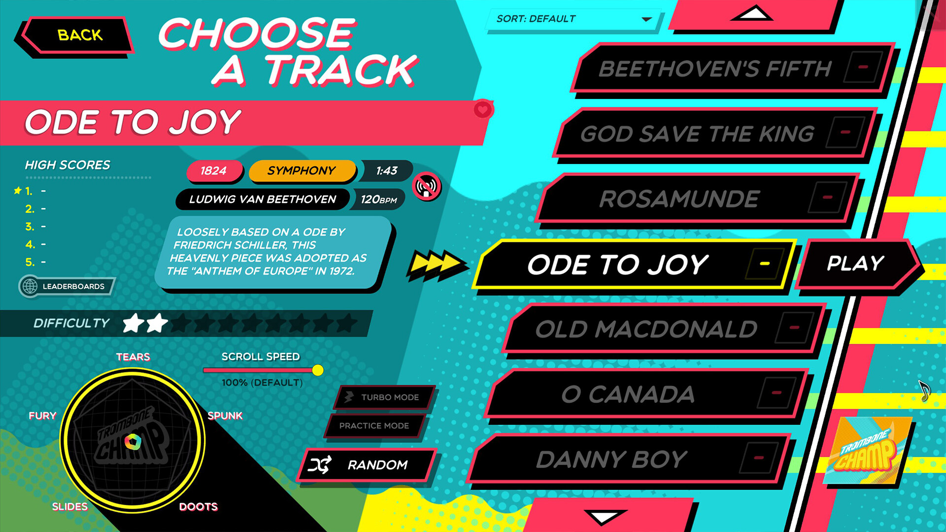 트롬본 챔프에는 60가지가 넘는 트랙이 준비되어 있습니다. 국가, 행진곡, 클래식 음악, 일렉트로닉, 전통 민요 등 장르도 다양하죠. 흥미로운 게스트 아티스트들의 트랙도 들어 있답니다. 트랙마다 음악에 맞춰 움직이는 특별한 애니메이션 배경도 준비되어 있습니다!