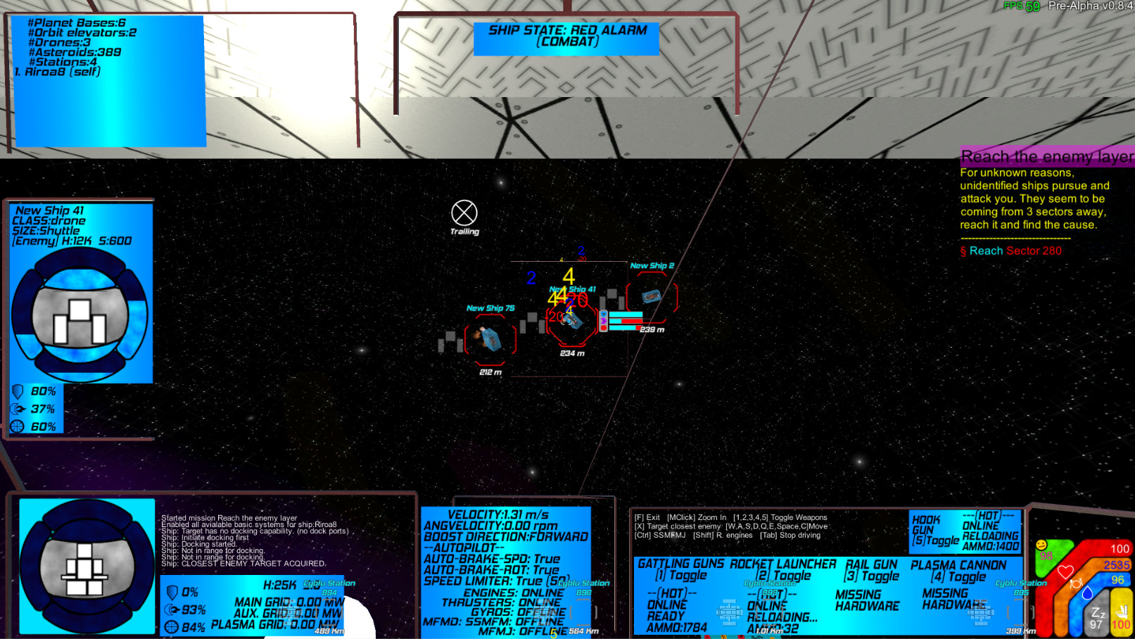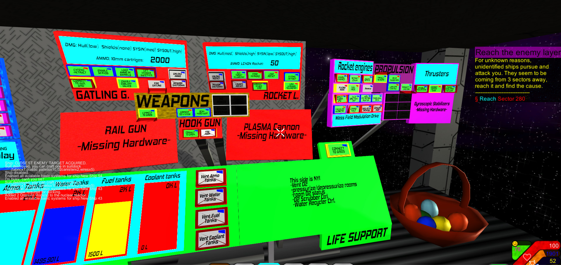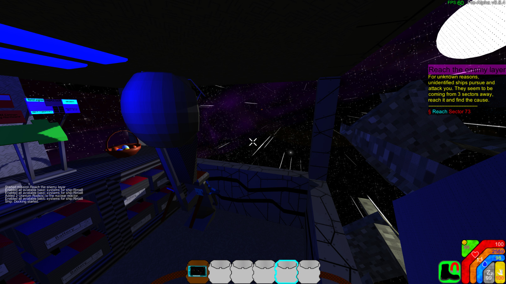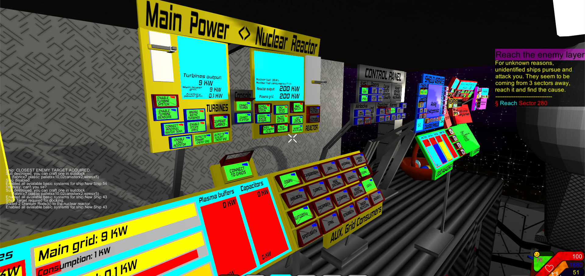 Build your ship, defend against drone waves and explore hundreds of sectors filled with stations, asteroids and planets with lots of POIs. The ship systems can be controlled via consoles with several hundred buttons. Craft equipment and blocks, loot the POIs and disabled drones.
