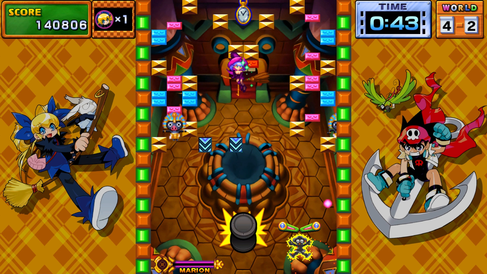 Control the flipper and shoot the pink ball = puck to break all the blocks to clear the stage.