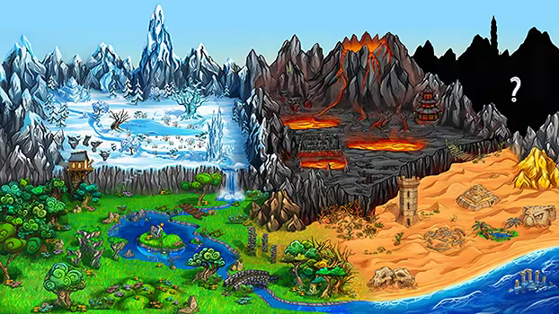 - World regions drastically impact gameplay. For example, in a forest, you can dive into the clear water; whereas, in colder regions, the water is frozen to a solid block of ice that can be walked on. Near the volcano, on the other hand, the water has been vaporized by molten lava that immediately kills any beast that touches it