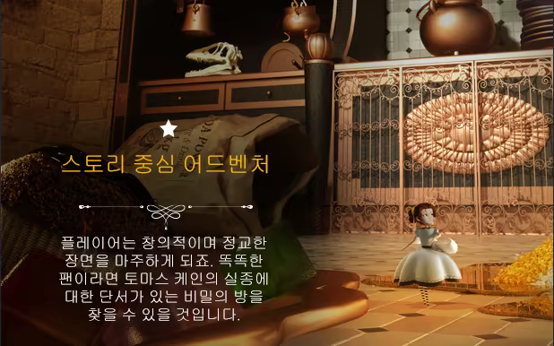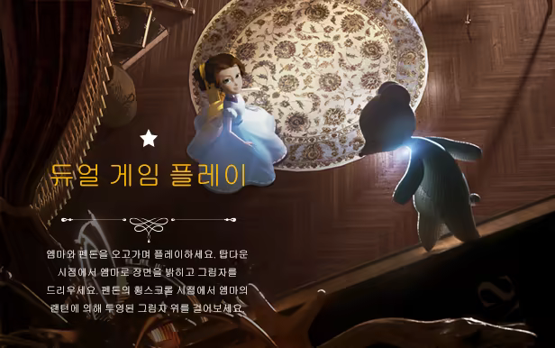 빛으로 만드는 그림자의 길, 그림자로 보조하는 빛의 여정 실종된 마술사를 찾기 위해 거대한 저택을 헤메는 소녀 엠마와 곰인형 펜톤의 이야기를 담은 퍼즐 게임이다. 근대 유럽의 저택 내부를 보는 것만 같은 풍경은 놀이공원과도 같아 구경하는 재미가 상당하며, 감미로우면서도 격정적인 배경 음악이 게임의 분위기를 한층 고조시킨다. 여기에 엠마와 펜톤을 번갈아 조종해 각자 현실의 영역과 그림자의 영역에서 움직이는, 빛과 그림자를 소재로 한 게임 플레이가 인상적이다. 마침 작년 말에 빛과 그림자라는 소재를 준수하게 풀어낸 퍼즐 플랫포머 게임 쉐이디 파트 오브 미(Shady Part of Me)가 출시됐었는데, 공교롭게도 두 게임 모두 프랑스의 개발사가 개발한 인디 게임이다. 빛과 그림자라는 소재를 참 영리하게 써먹은 게임이다. 현실의 영역에서 움직이는 엠마로 광원이나 사물을 움직여 빛의 밝기나 그림자의 위치를 조절하고, 그림자의 영역에서 움직이는 펜톤으로 그림자 위를 걸어다니며 펜톤만이 작동시킬 수 있는 장치를 작동시킨다. 여기서 엠마는 탑뷰 시점으로 비치고 펜톤은 사이드뷰 시점으로 비치면서 두 캐릭터의 시점이 다르다는 점이 매우 독특하게 다가온다. 또한 두 캐릭터의 움직임에 따라 화면을 비추는 카메라 시야가 매우 세밀하고도 정교하게 변해 플레이어의 입장에서 일말의 위화감이나 이질감 없이 자연스럽게 게임에 적응하게 된다. 뿐만 아니라 빛의 세기와 위치에 따른 그림자의 변화 역시 아주 섬세하게 구현돼있어 보기에도 즐겁고 실제로 플레이하기도 매우 편하다. 두 캐릭터의 협동 플레이에 대한 대비 또한 잘 갖춰져 있다. 빛의 세기와 위치에 따른 그림자의 변화는 엠마의 시야만으로도 충분히 파악할 수 있어 펜톤이 나아가야 갈 길을 편하게 잡아줄 수 있다. 그리고 그림자 속의 움직임에 따른 변화도 현실 상에 뚜렷이 드러나 펜톤의 시야만으로도 엠마가 해야할 일을 적절히 추론해낼 수 있다. 모든 레벨에서 두 캐릭터의 역할과 비중이 고르게 분배돼있어 한 캐릭터만 오래 움직이는 일 없이 골고루 교대하며 게임을 플레이하게 된다. 다만 퍼즐의 난이도 자체는 크게 어렵진 않은 편이다. 생각보다 퍼즐의 디자인이 단순한 편이기도 하고 다른 매커니즘의 응용도 그렇게까지 다채롭진 않다. 각 챕터마다 새로 등장하는 환경과 매커니즘은 직관성이 좋아 작동 기전을 금방 파악할 수 있어 빛과 그림자의 세기와 강도만 잘 조절하면 대부분의 퍼즐은 무난히 풀릴 정도다. 다양한 매커니즘의 응용보다는 빛과 그림자라는 그 소재 자체에 충실한 모습이고, 그만큼 각 챕터와 스테이지가 딱 떨어진다고 할 만큼 깔끔한 구조를 보여준다고도 볼 수 있을 것이다. 조작이 살짝 먹히는 감이 있긴 하지만 크게 문제가 될 정도는 아니다. 그보다는 서사가 존재하는 게임임에도 불구하고 서사가 살짝 빈약하다는 점이 살짝 아쉽다. 각 챕터의 시작부분과 끝부분에 엠마와 펜톤의 이야기를 담은 영상이 드러나는데 내용의 연결이 썩 매끄럽진 않다. 케인의 실종에 관한 내용이나 엠마와 펜톤이 서로 협력하는 과정이 명확하게 서술되지 않고 곳곳에 숨겨진 명화를 찾아도 그 내용을 정확히 파악하긴 힘들다. 어차피 서사가 중요한 게임은 아니긴 하다만, 기왕 서사를 넣었다고 한다면 좀 더 제대로 된 서사를 보여주는 편이 좋았을 것 같다. 아름답고 기묘한 근대풍 저택 내부는 놀이공원을 보는 듯한 매력이 있고, 현실과 그림자를 번갈아 오가는 게임 플레이는 독특하면서도 그 퍼즐의 완성도가 결코 나쁘지 않다. 쉐이디 파트 오브 미와 더불어 빛과 그림자라는 컨셉의 게임을 찾는 이들에게 강력히 권장할 만한 인디 게임. https://post.naver.com/viewer/postView.naver?volumeNo=32616976&memberNo=40601392