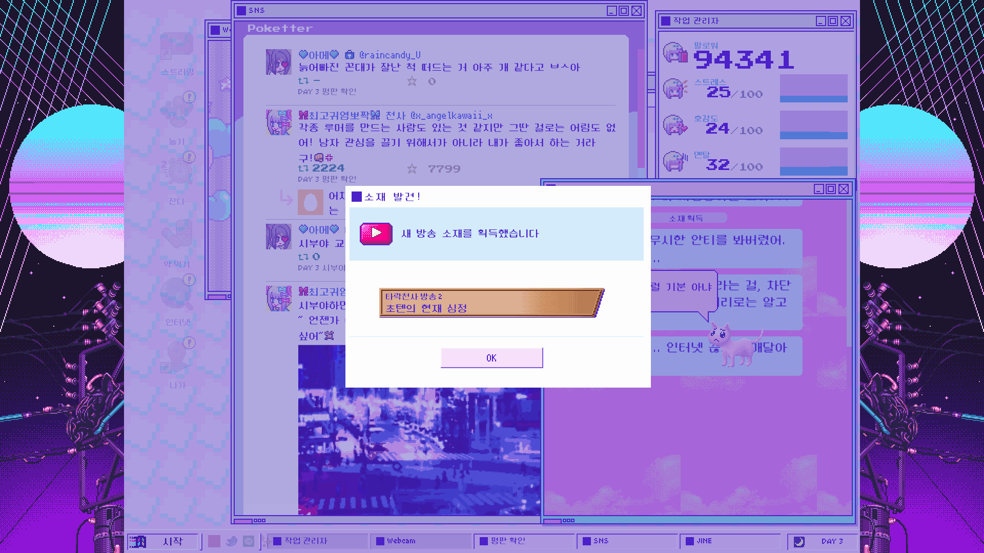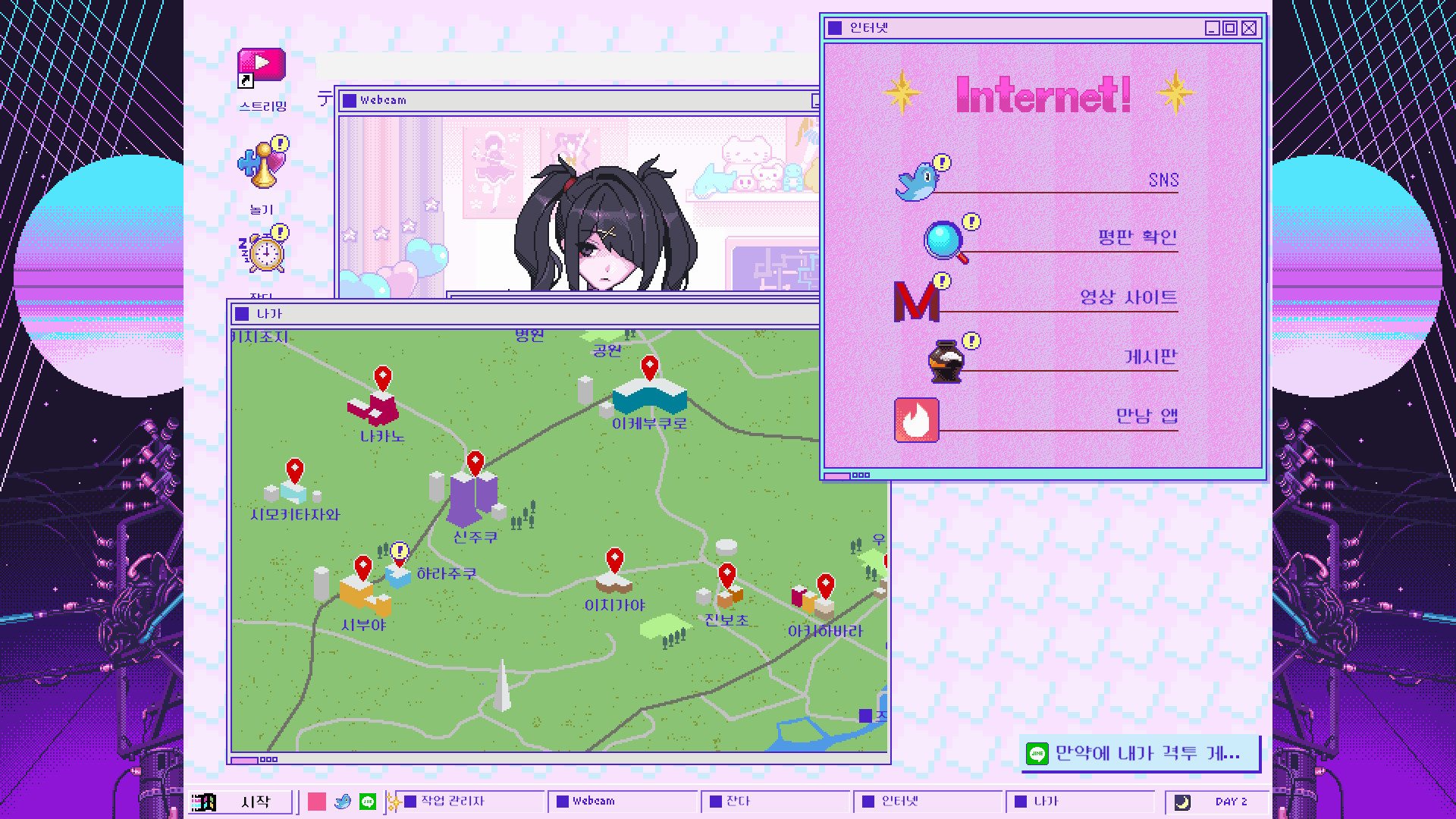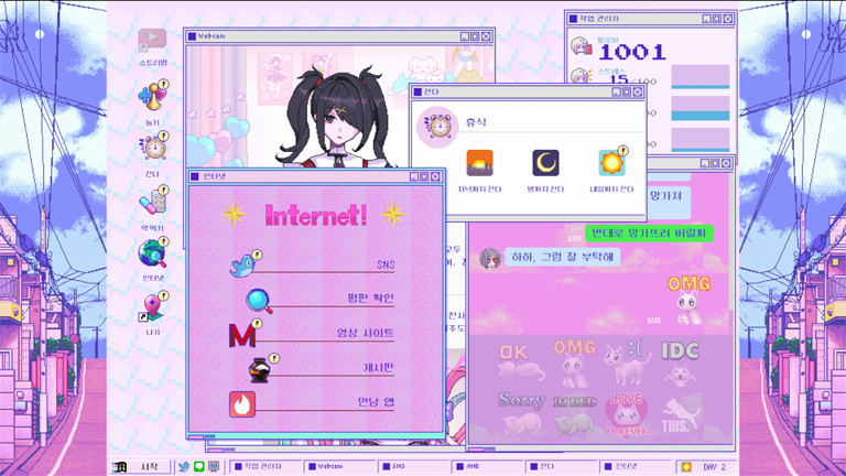 마음의 병과 자극적인 소재들 인터넷 방송을 진행하며 하루하루를 보내는 멀티 엔딩 게임입니다 주인공인 아메는 심적으로 불안정하고 플레이어가 직접 스트레스와 호감도 등 수치를 관리해 줘야 하기 때문에 게임을 진행하다 보면 [spoiler]약물 과다 복용, 만남 어플과 같은[/spoiler] 어둡고 자극적인 소재들을 이용하게 됩니다 때로는 불쾌한 이벤트가 발생할 수도 있습니다 게임 진행을 위해 자극적인 요소들을 아메에게 시키는 일은 상당히 죄악감이 들었어요 니디 걸 오버도즈에서 음울한 세계를 정말 잘 표현했다고 생각합니다 다루는 소재가 소재다 보니 선뜻 추천드리기는 힘드네요 게임 내 인터페이스도 잘 만들어졌고 게임 진행 상황에 따라 바뀌는 배경과 음악의 퀄리티가 좋아요 도전과제는 확률적인 요소와 특정 환경을 요구하지만 100% 달성이 그리 어렵지는 않아서 엔딩을 수집하는 겸 같이 도전하시는 걸 추천합니다 ★★★☆