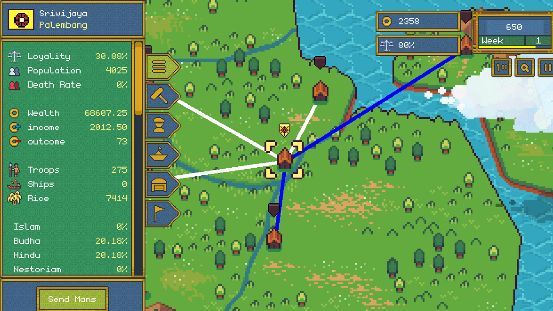 Dato of Srivijaya is historical real time strategy set in 7th century at Southeast Asia after Funan empire in Indocina has fall and regional power has shift to Srivijaya, unknown kingdom which rise from upstream South Sumatra's river to emerging great maritime power in Asia for several centuries. In 2025 version, all kingdoms in Southeast Asia now playable and the map has expanded to North Vietnam and South Myanmar.