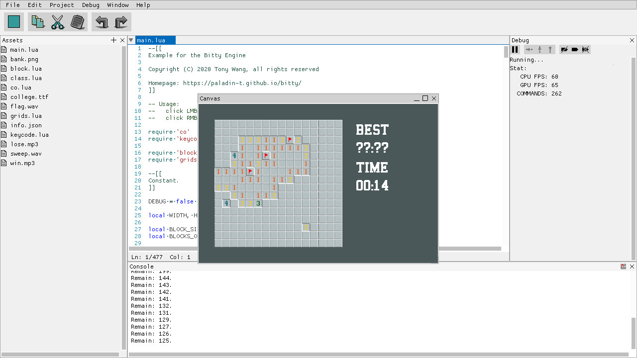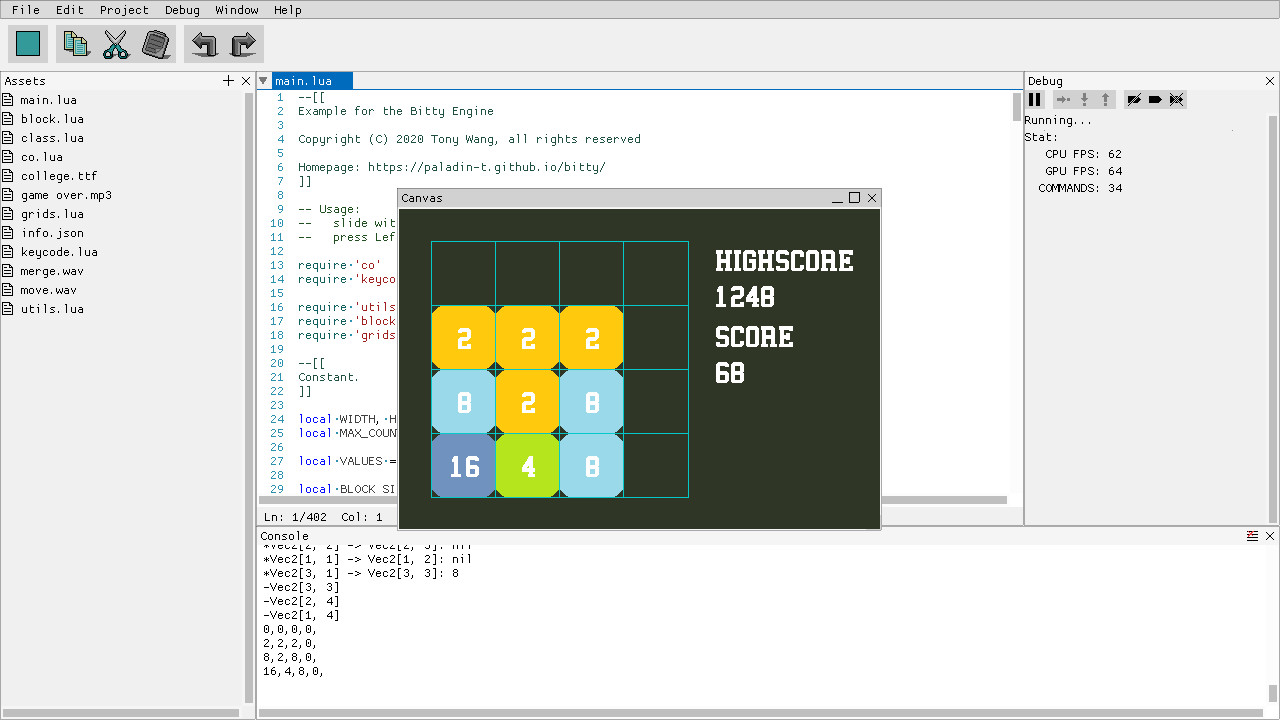 Bitty Engine is a cross-platform itty bitty 2D Game Engine. The full featured engine is programmable in Lua and integrated with built-in editors. It keeps the nature of both engine's productivity, and fantasy computer/console's ease to iterate.