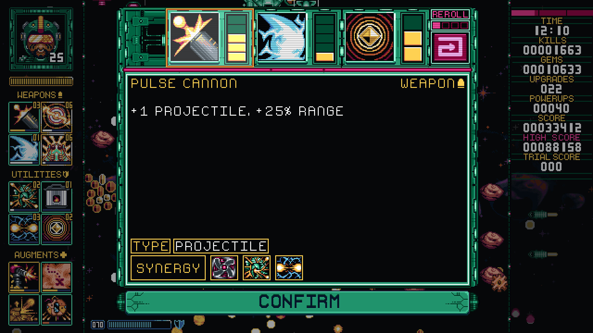 느리고 밀집된 탄막 슈팅. 뱀서라이크를 살짝 끼얹은, 우주를 배경으로 작은 우주선을 조종해 적들을 처치하고 최대한 멀리, 최대한 오래 버텨야 하는 탄막 슈팅 게임이다. 레트로 풍의 픽셀 그래픽과 사운드는 취향을 살짝 타고, 게임 화면만 딱 놓고 보면 탄막 슈팅 게임으로서 특별한 구석은 안 보인다. 왠지 먼 옛날 오락실에서 흔히 보일 법한 느낌의 게임 같기도 하고 말이다. 종스크롤 슈팅 게임치고는 게임의 속도와 템포 모두 아주 느린 편이다. 기체가 앞으로 나아가는 속도는 느리고 적이 나타나고 투사체를 발사하는 속도 또한 느리다. 여기에 보석을 수집해 레벨을 올리는 템포 또한 다소 느린 편이다. 화면을 한가득 수놓아 정신을 쏙 빼놓는 탄막 슈팅 게임을 기대했다면 그야말로 하품을 쏟아내게 될 것이다. (후술하겠지만 게임의 속도가 느리다고 해서 난이도가 만만한 건 결코 아니다.) 이렇듯 말도 안되게 속도와 템포가 느린 탄막 슈팅 게임에 뱀서라이크의 요소를 살짝 첨가해 이질적인 방향의 게임성을 창조해낸 모습이다. 레벨을 올려 무기와 유틸리티를 하나씩 습득하게 되는데, 각 무기와 유틸리티 간의 시너지가 존재해 이를 어떻게 선택하는 지에 따라 게임의 양상이 크게 바뀐다. 여기에 일부 무기와 유틸리티 조합에 따라 무기가 강화되기도 하니 이를 적절히 활용하는 것 또한 중요하다. 그 밖에 처음 시작시 고른 파일럿과 증대 효과에 따라 특성이 다르고 트라이얼을 통해 제약을 걸어 게임의 난이도를 올릴 수 있어 이 또한 매력적으로 다가온다. 시간이 지날수록 적들이 점점 화면에 쌓이고 공격 또한 거세진다. 5분 간격으로 등장하는 보스는 반복 플레이를 통해 패턴에 익숙해져도 무기와 유틸리티 조합이 잘 안 풀리면 데미지가 잘 안 들어간다. 여기에 게임을 시작할 때 제시된 실드의 양이 넉넉하긴 하지만 어차피 탄막을 제대로 피하지 못하면 데미지가 쌓여 그대로 게임 오버로 직행하는 건 매한가지다. 결국 뱀서라이크의 요소를 도입해 색다른 감각의 탄막 슈팅을 의도하긴 했어도 게임의 근본은 탄막 슈팅에서 크게 벗어나진 않는다. 플레이어의 피지컬을 어느 정도는 탄다는 의미이기도 하다. 총 세 개의 스테이지와 하나의 무한 모드가 준비돼있다. 각 스테이지는 15분 이상의 제한 시간 동안 버텨야 하는데 이지 모드와 스탠다드 모드를 통해 상대적으로 편하게 즐길 수도 있다. 그리고 트라이얼 모드를 통해 원하는 만큼 제약을 추가해 난이도를 올릴 수도 있다. 다른 파일럿과 증대 효과 등을 해금하기 위해선 특정 조건을 달성해야 하는데, 그 중에는 제약을 30 이상 걸고 클리어해야 하는 것들이 있어 꽤나 빡세다. (어차피 이것도 도전과제랑 연계돼있어 도전과제 100%를 노리려면 결국 전부 다 해야 하긴 한다.) 반면에 무한 모드는 말 그대로 죽을 때까지 무한정 플레이할 수 있고, 애프터모드라는 추가 요소도 존재한다. 무난해 보이는 종스크롤 탄막 슈팅에 뱀서라이크의 요소를 살짝 얹어 색다른 게임성을 선보이는 독특한 감각의 게임이다. 어디까지나 게임의 근본은 탄막 슈팅에 있다보니 난이도가 만만치 않긴 하지만, 뱀파이어 서바이버(Vampire Survivors)의 흔적이 다분히 묻어나오는 다른 뱀서라이크 게임보다는 확실히 신선한 면도 있다. 어딘가 색다른 시도를 보인 뱀서라이크 게임을 찾는 이들에게 추천한다. https://post.naver.com/viewer/postView.naver?volumeNo=34938446
