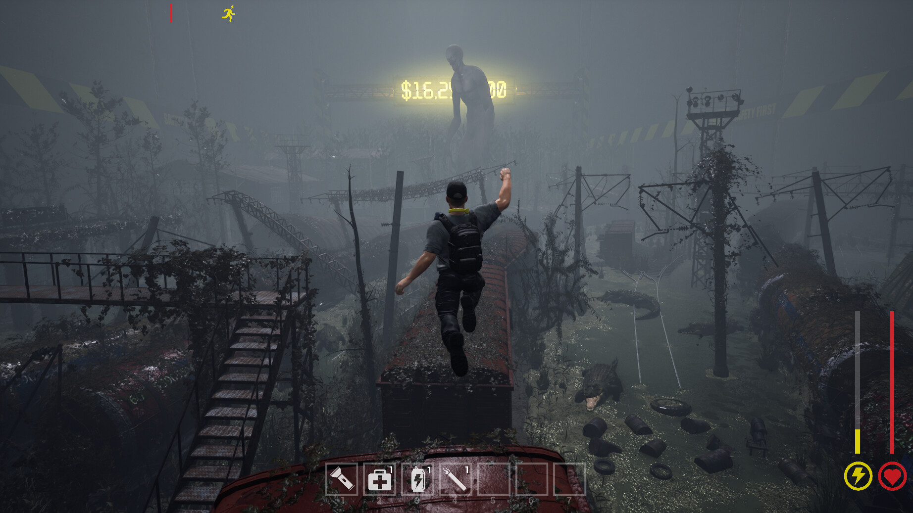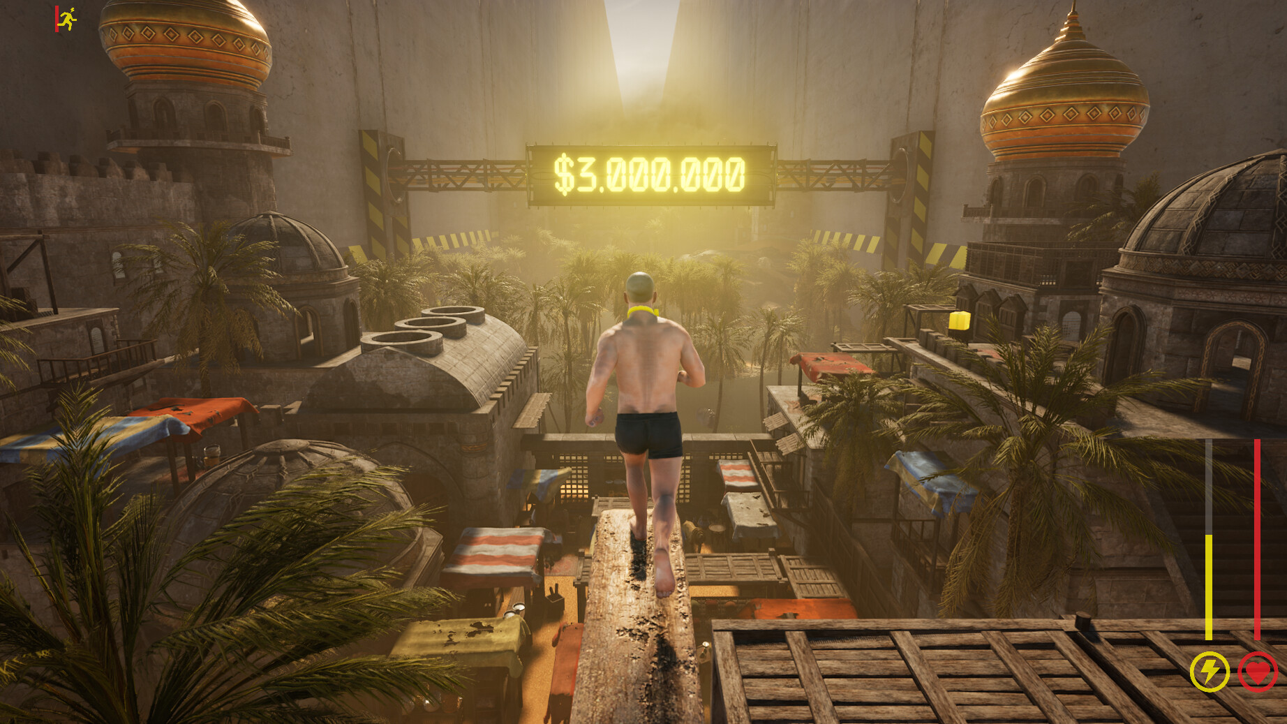 게임에서 당신은 미친 리얼리티 쇼에 참여하게 되는데, 쇼의 주요 조건은 거대한 구조물 내부에서 앞으로 나아가는 것으로, 통과하는 1km마다 100만 달러를 벌어들이는 것입니다.