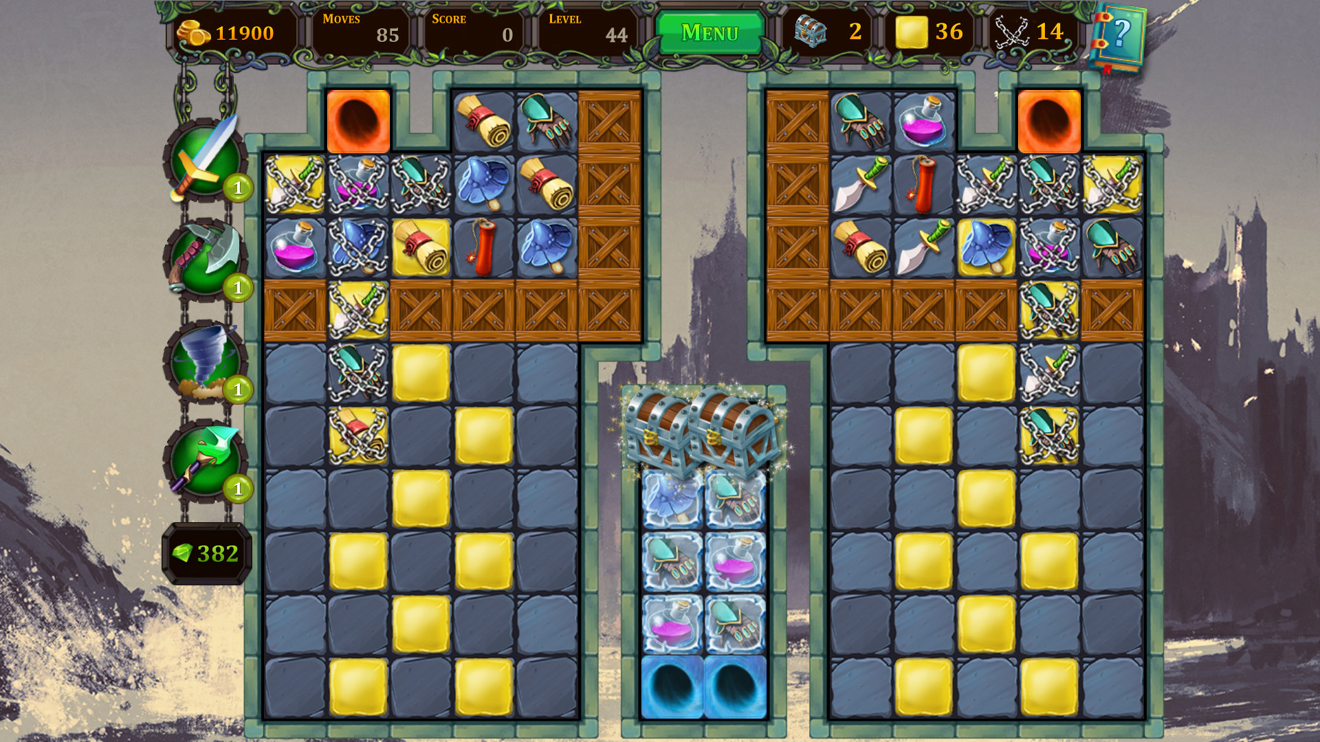 전작과 거의 같은 게임으로 54개 도전 과제도 1대1 대응합니다. 90개 레벨 깨고, 소드, 매직 스태프 파워업 20회 쓰면 과제 거의 다 깹니다. 신경 쓸 과제로 게임 끄지 않고 25개 레벨 연속으로 플레이하기, 6일 연속 게임 플레이하기가 있습니다. 마을이 3D 그래픽으로 바뀌고, 새로운 퍼즐이 추가됐습니다. 가장 좋은 건 속도가 빨라진 것입니다. 로딩 속도가 크게 줄어들었고, 매치 맞출 때 속도도 빨라졌습니다. 한국인이 가장 만족하는 업그레이드입니다. 이거 때문에 2편을 추천합니다. 마을에서 ESC 기능이 안 됩니다. ESC 메뉴 호출은 국룰이고, 다른 화면에서는 잘 됩니다. 그런데 마을에서만 ESC가 안 되고, 마우스로 메뉴를 눌러야 합니다. 그리고 메뉴에서 'QUIT GAME'이 빠졌습니다. 전작은 ESC 누르고 클릭 한 번 하면 게임을 끌 수 있었는데 이건 다운그레이드입니다.