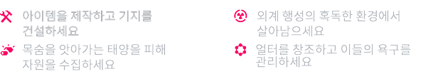 이동식 기지를 운영하기 위해서는 행성의 지표를 탐험하며 금속, 유기물 등 희귀 자원을 수집해야 합니다. 그러나 안전한 기지를 벗어나는 순간, 여러분과 얼터들은 태양에서 쉴 새 없이 쏟아지는 방사능과 외계 행성의 치명적인 이상 현상에 노출될 수밖에 없습니다. 게임 내 밤낮의 전환주기에 유의하며 작업 일정을 세심하게 조율하세요!