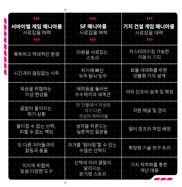 수집한 자원은 다양한 방식으로 활용할 수 있습니다. 필수 아이템을 만들 수도, 혹은 연구실, 휴게실과 같은 추가 모듈을 건설해 기지를 확장할 수도 있습니다. 하지만 때론 특정 얼터를 살릴 수 있는 아이템을 만들 것인지, 아니면 이상 탐지기 혹은 방사능 필터 등 임무 진행에 도움이 될 아이템을 만들 것인지 선택해야만 하는 순간도 올 것입니다. 모든 결정의 책임은 오롯이 플레이어 여러분의 몫이며, 모두를 만족시킬 방법은 없습니다.