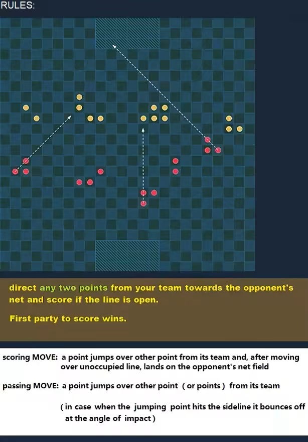This game allows to create scoring opportunities from many angles simultaneously what makes for a dynamic and exciting play. Direct any two points from your team towards the opponent's net and score. First party to score wins. It also features three board designs with zoom.