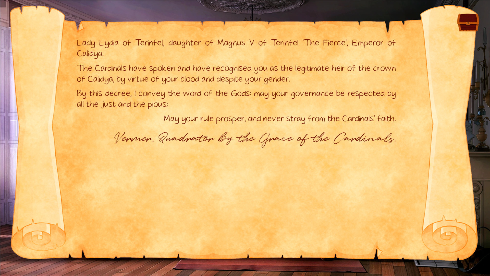 Imperial Grace is a visual novel / otome game, focusing on politics and romance in an imaginary medieval world. You play as the new Empress of Calidya, who must rule her country despite the hardships and precariousness of her position. During your reign, you will face many difficult choices, which can dramatically change the future of Calidya as well as your own destiny. You may even find love in difficult times, but be careful: love can equally help you overcome the perils you face and get in the way of your duty..