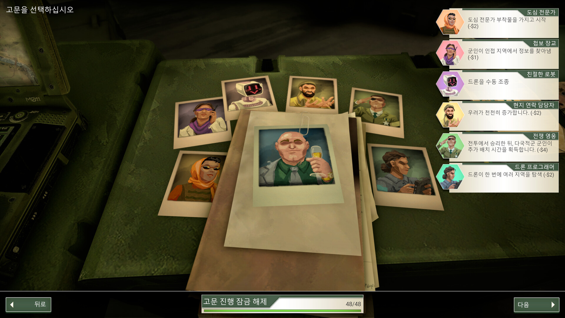 작전에 강력한 신규 고문을 채용해보세요. 고문은 놀라운 혜택을 제공하지만 높은 연봉을 요구합니다! 장관, 기사, 드론 조종 로봇을 포함한 18개의 새로운 고문과 함께 그 어느 때보다도 풍성한 전술 옵션을 이용해보세요.