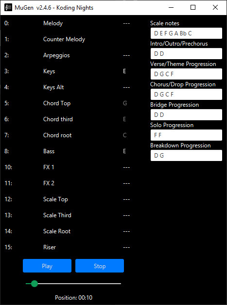 MuGen은 가이드형 랜덤 생성과 음악 이론을 사용해 설정한 조건에 맞는 로열티 프리 음악을 만듭니다. 영감을 얻고 창의력을 펼쳐 보세요. 게임, 영상, 기타 연습용 음악 제작에 적합합니다.