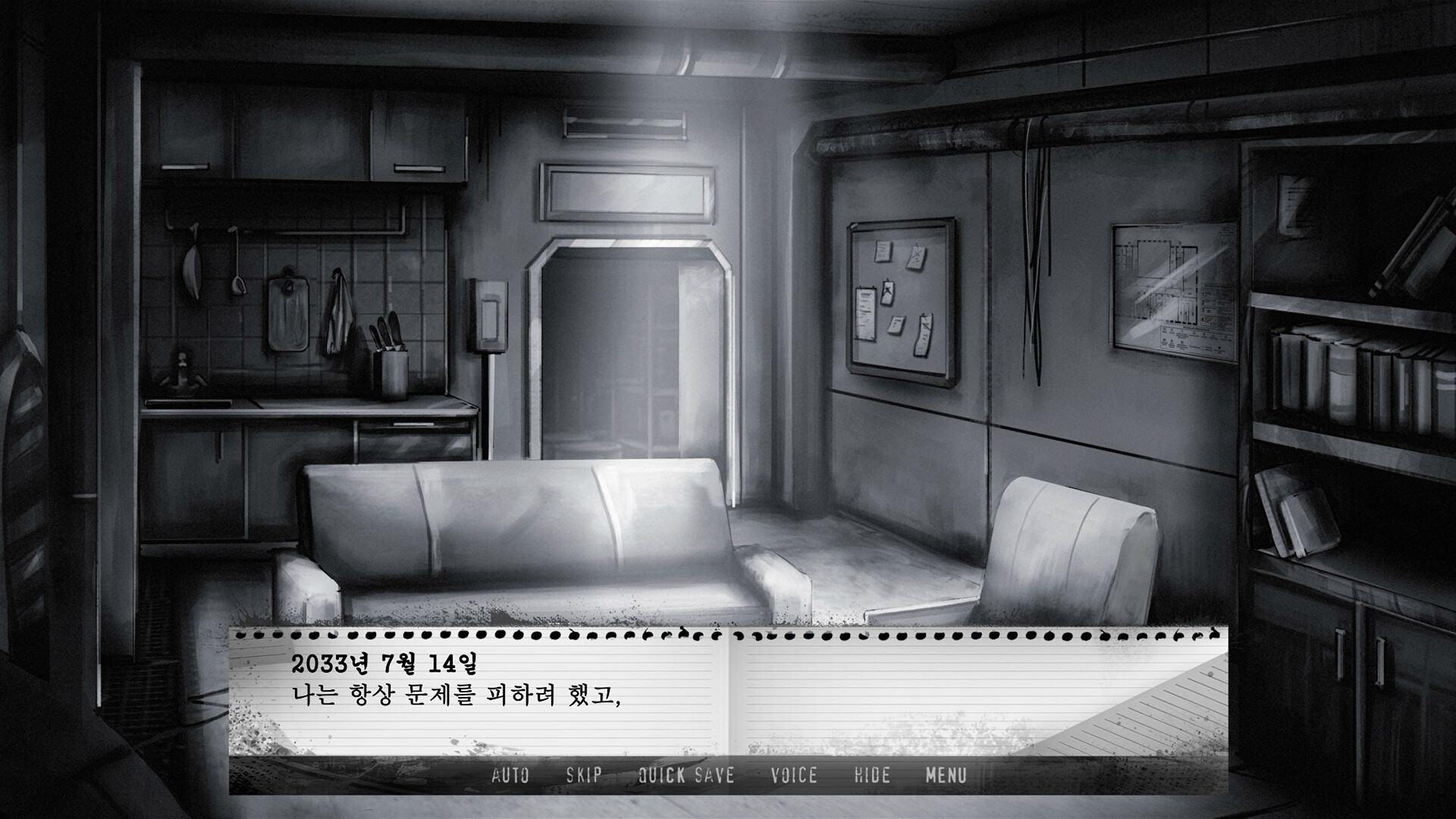 《벙커일기》 이 작품은 영화감독 김성찬의 동명 단편 소설을 원작으로 한 심리 드라마이며, 이를 비주얼 노벨로 각색한 작품이다. 이야기는 전례 없는 속도로 인간을 파괴하는 바이러스가 퍼지는 팬데믹 속에서 시작된다. 주인공은 그 위협에 대비한 몇 안 되는 사람 중 한 명이었다. 그는 세상과 단절된 채 자율 벙커에 숨어드는 데 성공했다. 그러나 때때로 고독은 구원이 될 수도, 절망이 될 수도 있다. 결국, 철문 너머에서 들리는 작은 소리는 감염자의 신호일 수 있고, 그림자는 언제든 나를 없애려는 적이 될지도 모른다.