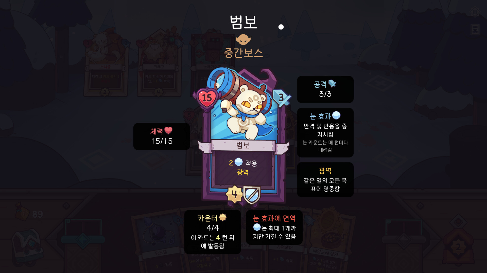 로그라이크 덱빌딩 게임. 거기에 캐릭터와 진영배치 요소를 추가했다. 장점들, 아트워크가 굉장히 훌륭하다. 아기자기한 그림체에 세부적인 디테일이 잘 살아 있다. 눈세상을 배경으로 하고 있어 자칫 단조로워 질 수 있음에도 상당한 상상력이 가미되어 게임을 하는 동안 다채롭다는 인상을 많이 받았다. 해금이 진행되며 생기는 여러 선택지와 키워드들도 강점이다. 특히나 부적을 통해 카드에 강화 효과를 주는 부분이 인상적이었다. 같은 카드라도 강화 요소에 따라 다른 사용 방법이나 다른 형태의 컨셉 구축이 가능하다. 단점들, 난이도에 대해서는 다른 리뷰에서도 많이 지적받는 부분이고 공감한다. 적들은 더 많은 체력과 공격력을 가지며, 굉장히 까다로운 능력을 가지고 있다. 장르 원조격인 슬더스와 비교해본다면, 슬더스는 (0승천 기준으로) 초반에는 잡몹을 빠르게 컷하고, 적절한 방어를 통해 체력을 온전하며, 덱의 평균 밸류를 올리거나 시너지, 콤보를 준비해서 점점 강해지는 적들을 상대하는게 주가 된다. 이 게임은, 초반에는 새로운 시스템에 어버버거리며 내가 죽은 이유는 내 실수라 생각하다가 새로 해금되는 지도자와 부족의 신규 능력과 시너지, 부적을 통한 사기로 '아 이 게임은 이렇게 하는 구나'를 깨닫게 되는 과정이 주가 된다. 종합, 덱빌딩 로그라이크나 다른 로그라이크류에서 1,2 딜 차이로 죽고 사는 상황을 강종컨으로 되돌리며 최적해를 찾는 것을 즐기는 사람에게는 별로 추천할만하지 않다. 좀 느슨한 마음으로 몇 번 리트하면서 가끔 사기치는 맛으로 로그라이크를 하는 사람에게 추천할만하다.
