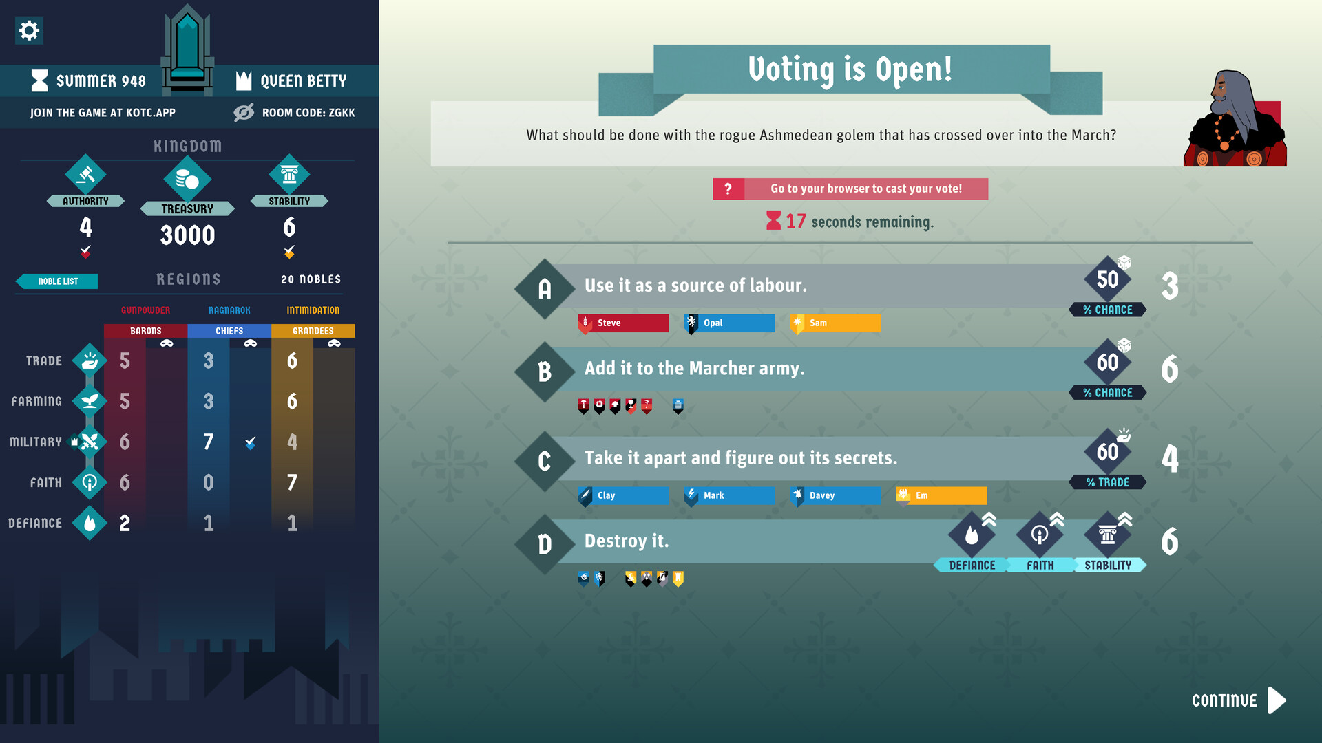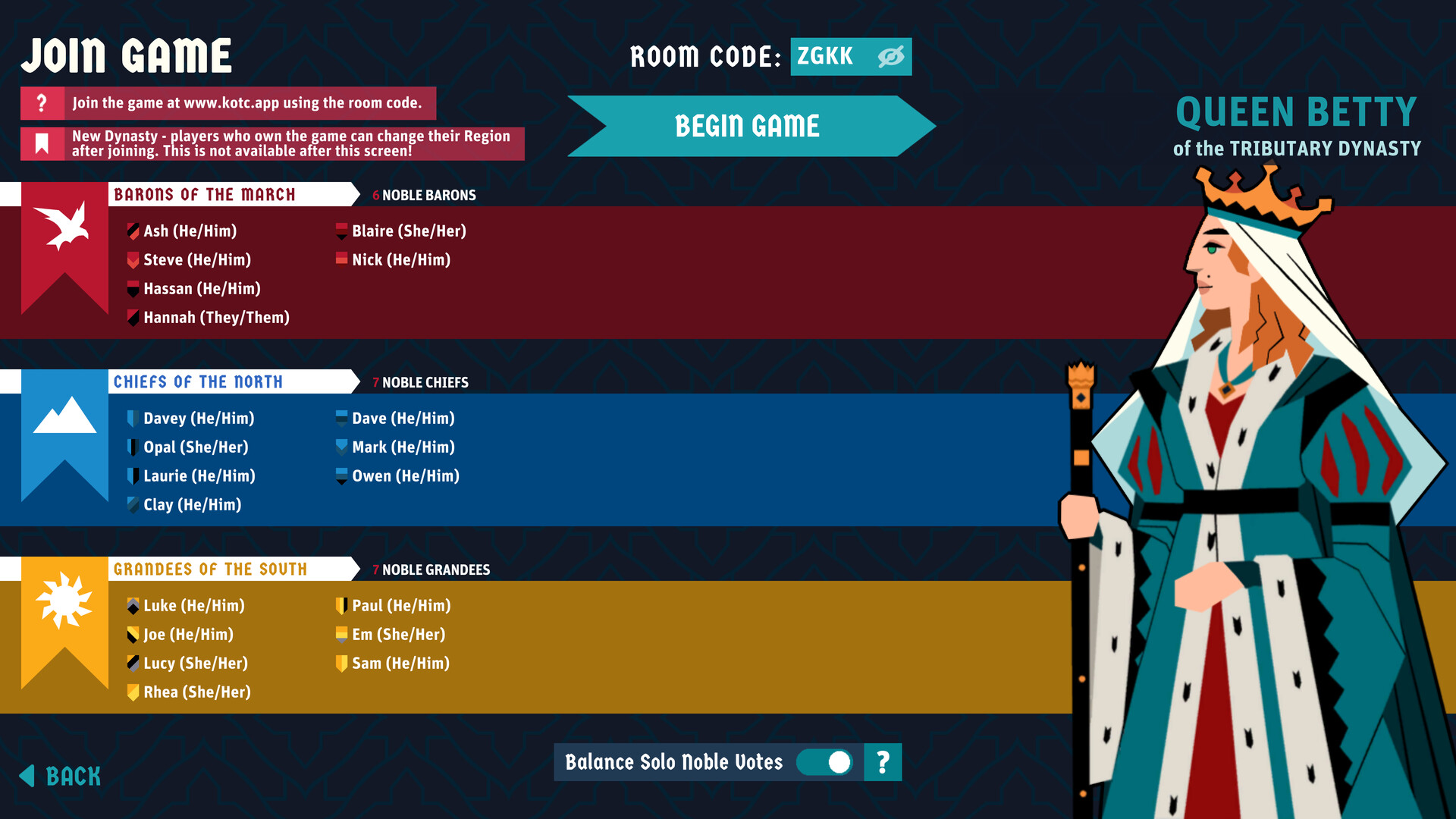 - 의회의 귀족들은 게임에 참여하면, 왕국의 서로 다른 지역으로 배정될 겁니다. 처음에는 위협적으로 서로를 물어뜯겠지만, 상황에 맞춰 언짢지만 동맹을 맺을 수도 있겠죠.