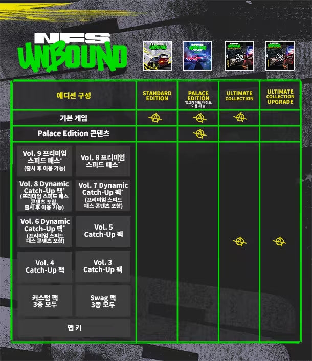 얼티밋 컬렉션*을 통해 궁극의 Need for Speed Unbound 경험을 단 하나의 패키지로 만나 보세요. Need For Speed Unbound가 포함되어 있으며, 출시 후에 추가된 모든 프리미엄 콘텐츠와 Vol. 9 프리미엄 스피드 패스를 즉시 이용할 수 있습니다. 9대의 완전히 커스터마이징할 수 있는 차량과 45개 이상의 커스텀, 100개 이상의 추가 꾸미기 아이템을 이용해 보세요.