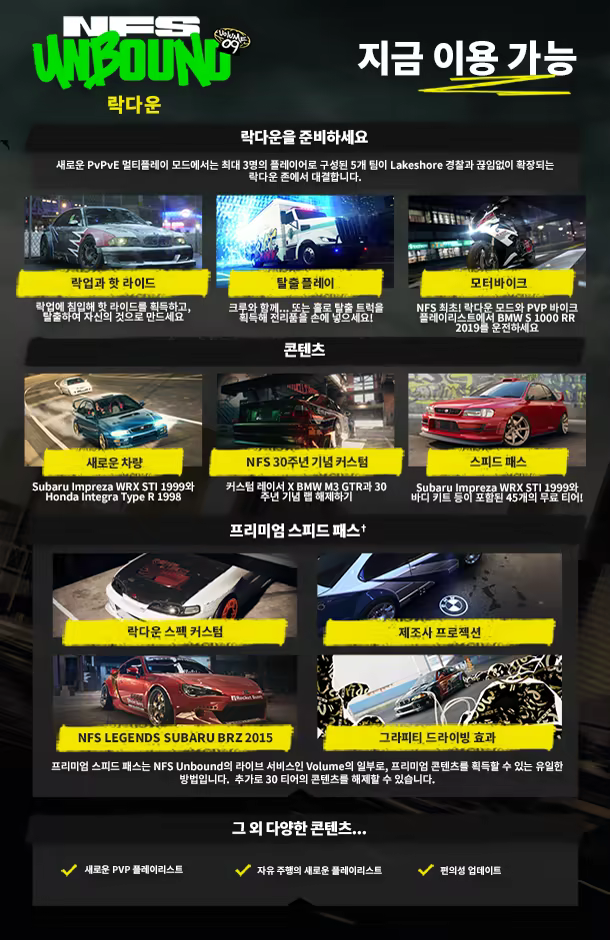 - VOL. 9: 락다운 — 크루와 함께 생사를 걸고 끝까지 달리세요. NFS 최초로 모터바이크를 타고 창고에 침입해 핫 라이드를 손에 넣고, 커스터마이즈 가능한 Subaru Impreza WRX STI ’99와 Honda Integra Type R ’98을 만나 보세요.