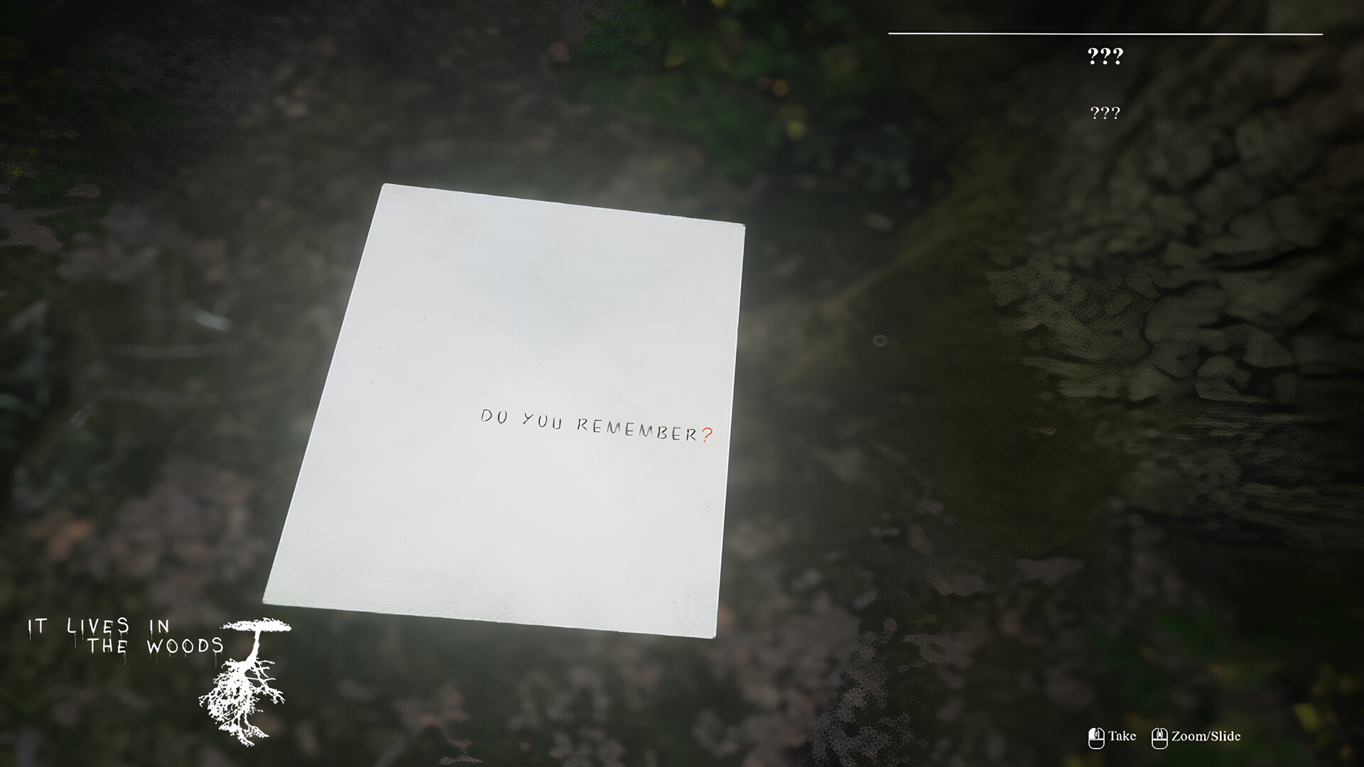 ItLivesInTheWoods is a first-person psychological horror set in the forests of Canada. You are Ibrahim, a father who has recently lost his daughter whilst on a hiking trip in the forest last winter. You hope to find out what happened to your daughter and whether you can reunite with her.