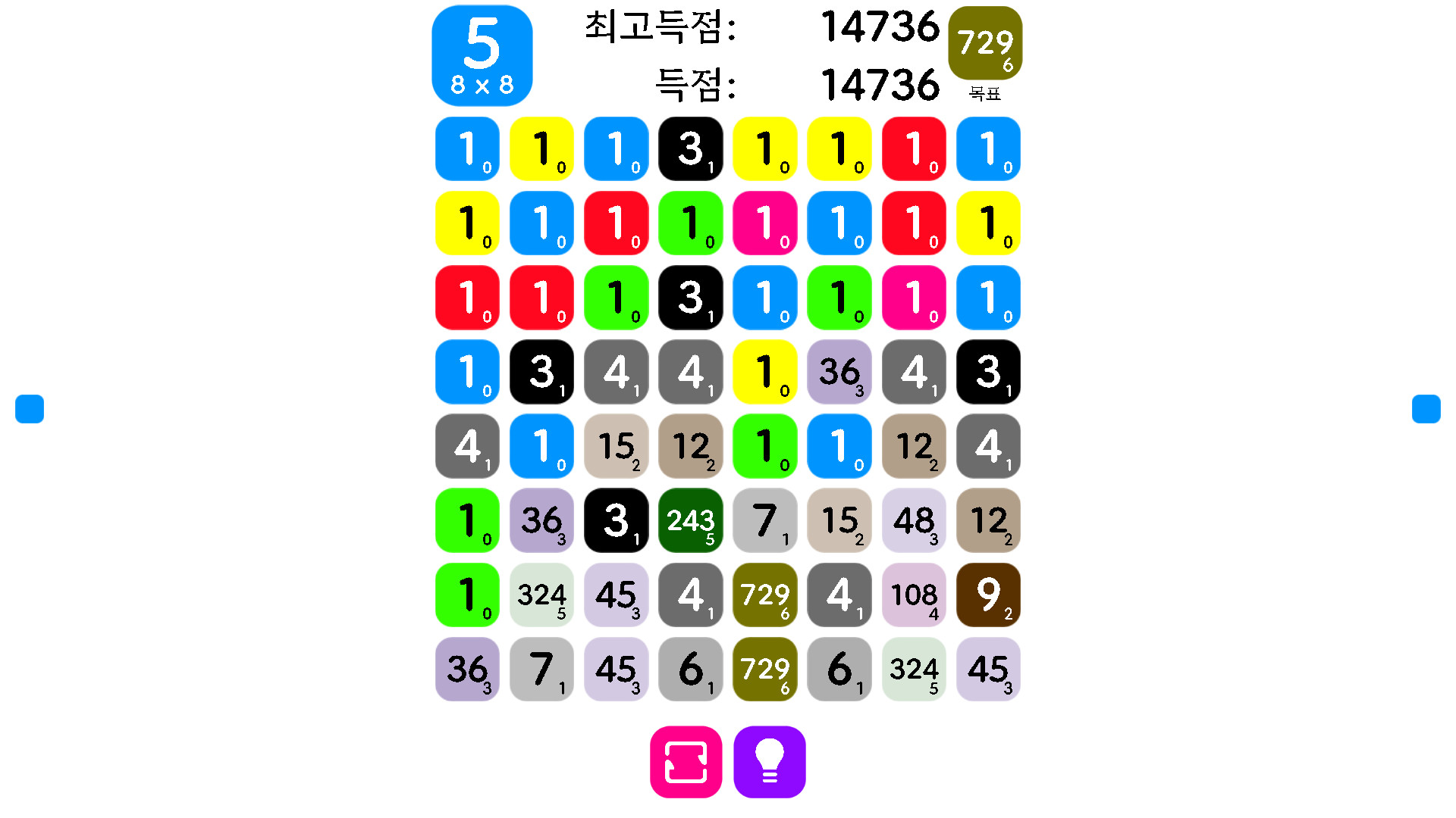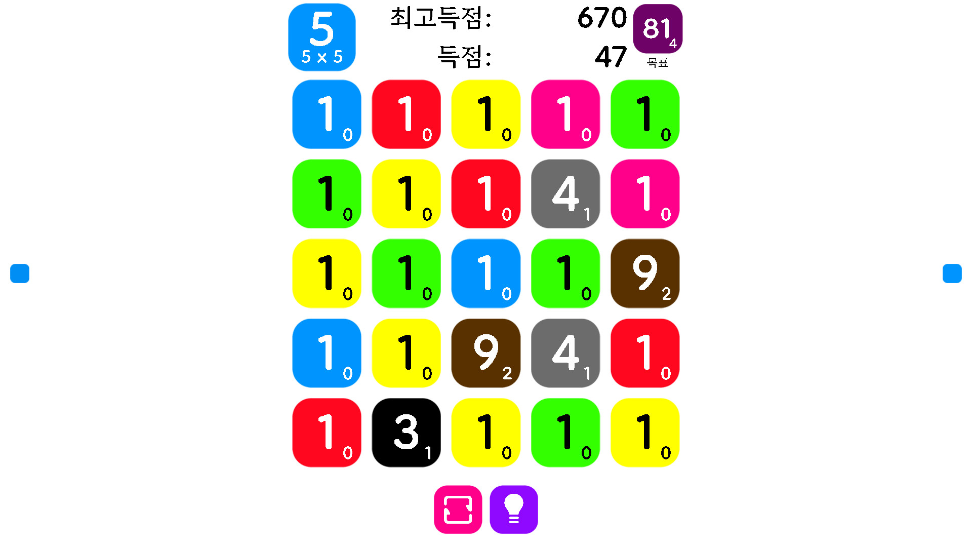 숫자 합치기 게임 숫자를 합치는 게임입니다. 1부터 시작하여 동일한 색상의 동일한 숫자 3개 이상이 서로 연결되면 합산되면서 블록의 레벨이 오르고 합산삾의 블록이 생성되죠. 1이 3개가 연결되명 1레벨의 3이되고, 1 5개가 모이면 1레벨의 5가 생성됩니다. 블록의 레벨에 따라서 이동가능한 범위가 달라지게 되느대 0레벨은 십자 범위이고 2레벨은 네모, 3레벨은 여기서 다시 상하좌우 1칸씩이 늘어나죠. 그렇기에 높은 레벨의 블록을 만들어서 자유롭게 이동을 하고 이를 이용하여 주변의 블록들을 합산시키는 플레이도 가능합니다. 새로운 블록들을 만들어내다보면 새로운 모드가 언락되고 새로운 모드에서는 판의 크기가 다르다거나 등장하는 색상의 수가 다르다는 차이점이 존재하죠. 나는 3의 배수의 블럭들만 만들고 싶다고 해도 위에서 새로 생성되는 블록들에 의해 4나 5 그 이상이 6이나 7도 만들어지는 경우도 있어 의도된 상황으로 게임이 이어지지 않기도 합니다. 고런 변수들이 게임을 재밌게 해주지만 의도가 틀어져버리니 은근 짜증이 나기도...!