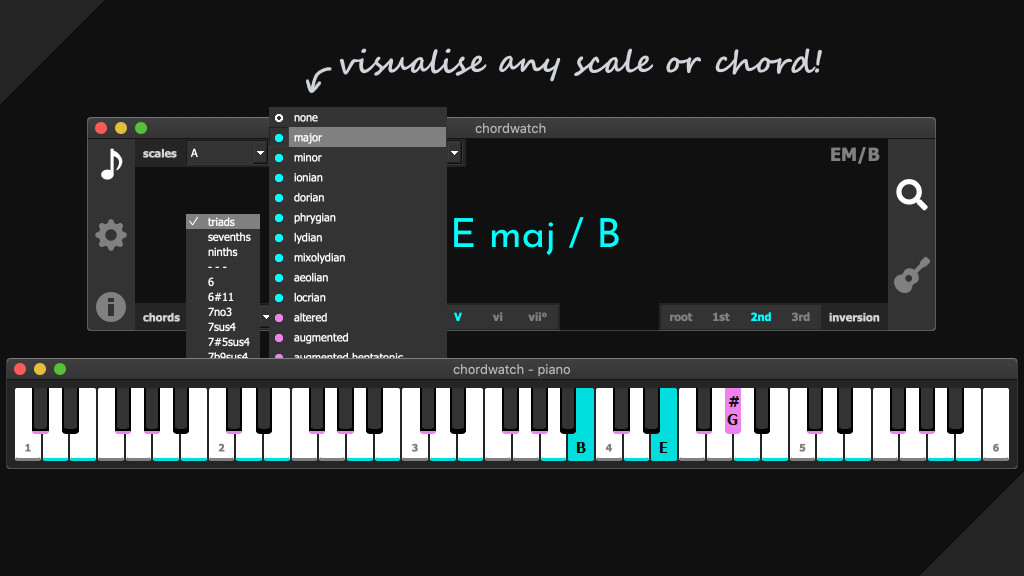 Are you a musician, producer, teacher or otherwise music tinkerer? Chordwatch makes the headache of learning chord names and scales extremely easy. Remove the mystery of music theory and instantly uncover anything you play. Standalone or with your DAW, Chordwatch is the ultimate sidekick for your music!