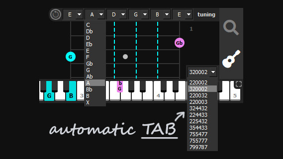 - A dynamic fretboard automatically generates the TAB for the chords you play, providing multiple fingering options along the guitar neck, adjusted for any custom tuning. Making it easy and fun to pick and strum.