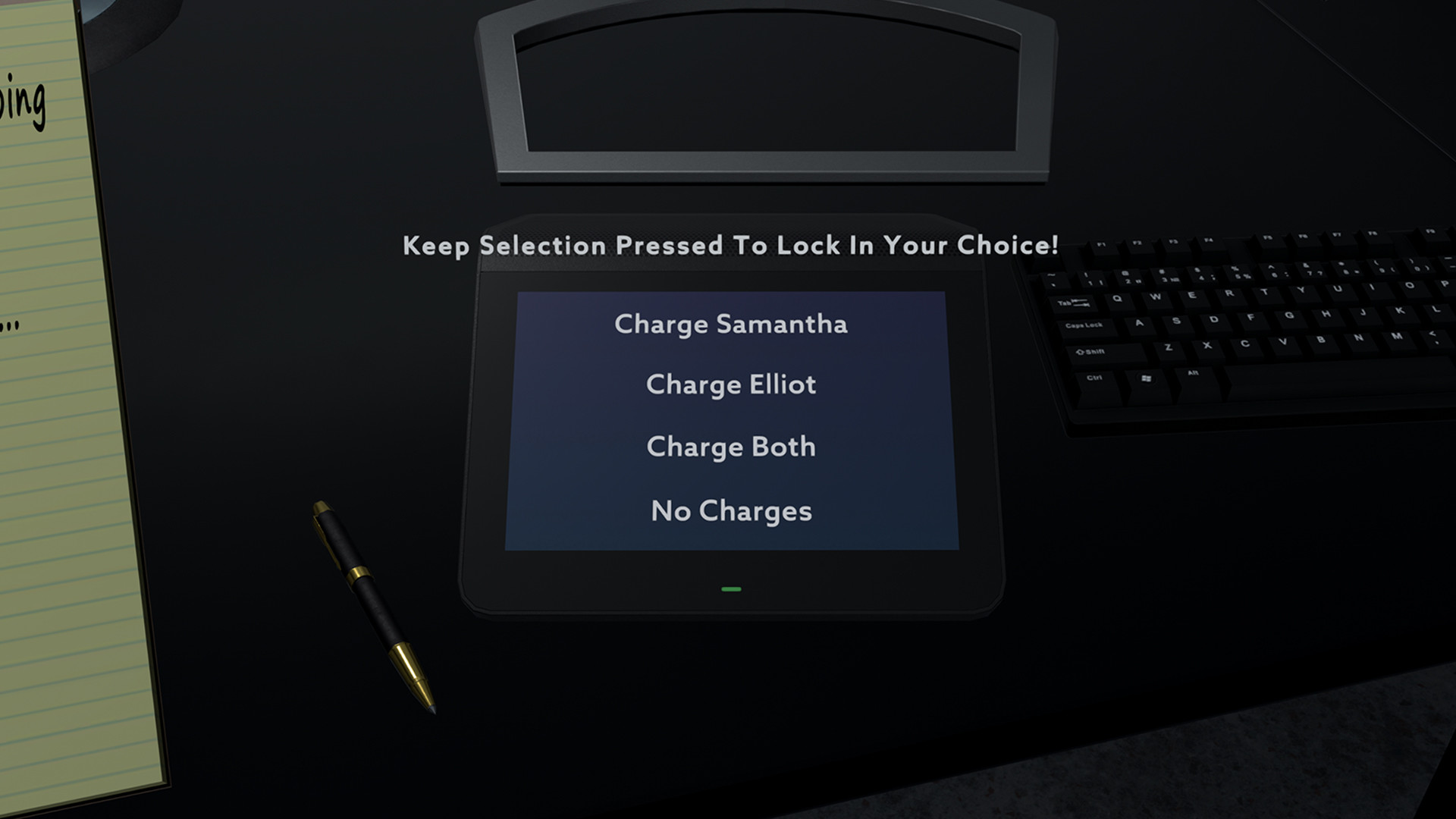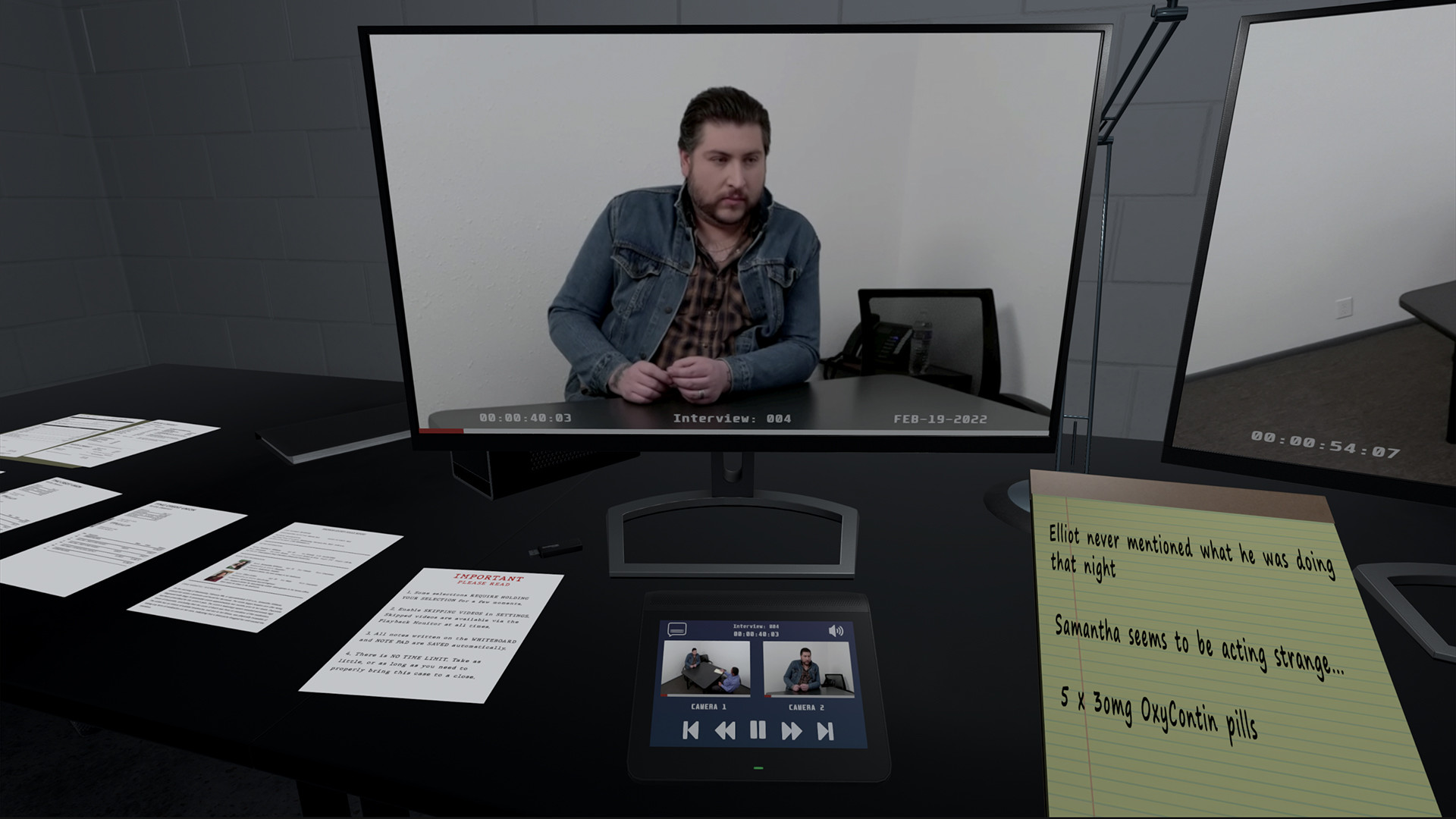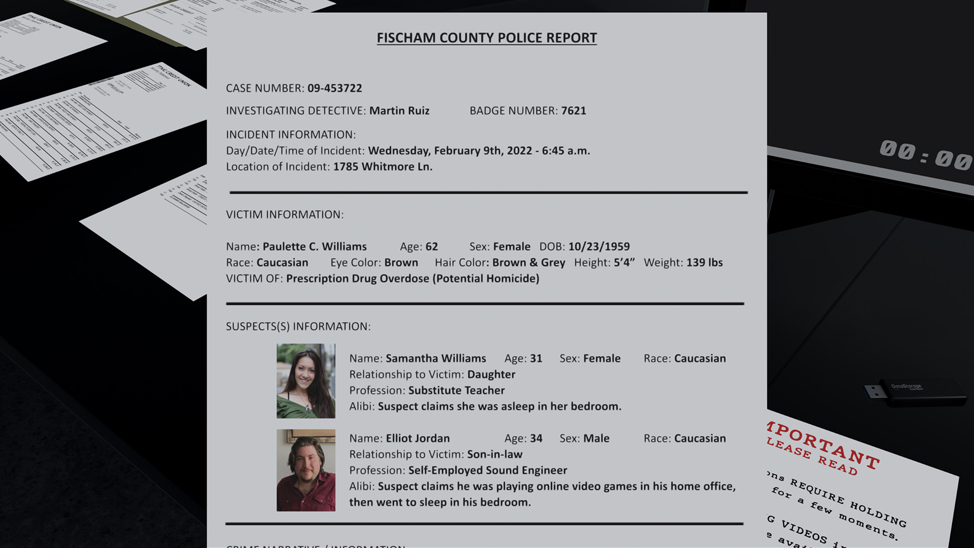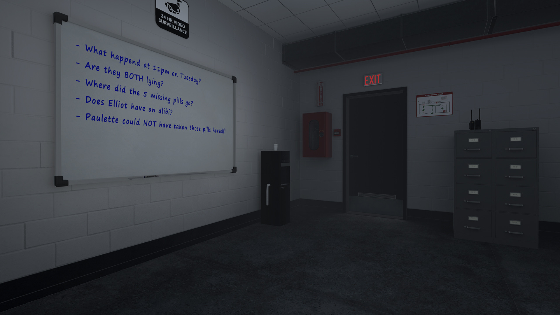 Paulette Williams, age 62, has been killed. There are only two possible suspects. In this short, choose your own adventure, police interrogation experience, you take on the role of the lead detective in the observation room. You must guide your partner to uncover the truth. Through the use of real-time suspect interviews, video playback, case files, and your own wits, you must make critical decisions that will shape the course of this investigation.