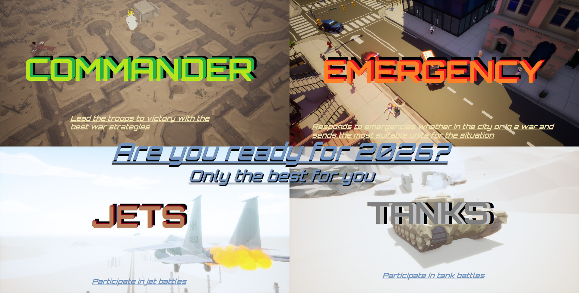 World of Dinosaurs (In Development), World of Primates (In Development), Stone Age, Ancient Egypt, Ancient Rome/Greece, Dascar Racing, Formula 1 Racing, Death Races, Viking Age, Medieval Age, The Dynasty, American Civil War, American War of Independence, World War I, World War II, World War III, Discovery of America, Russian War, Vietnam War (In Development), Afghanistan War, 21st Century, 24th Century, 27th Century...