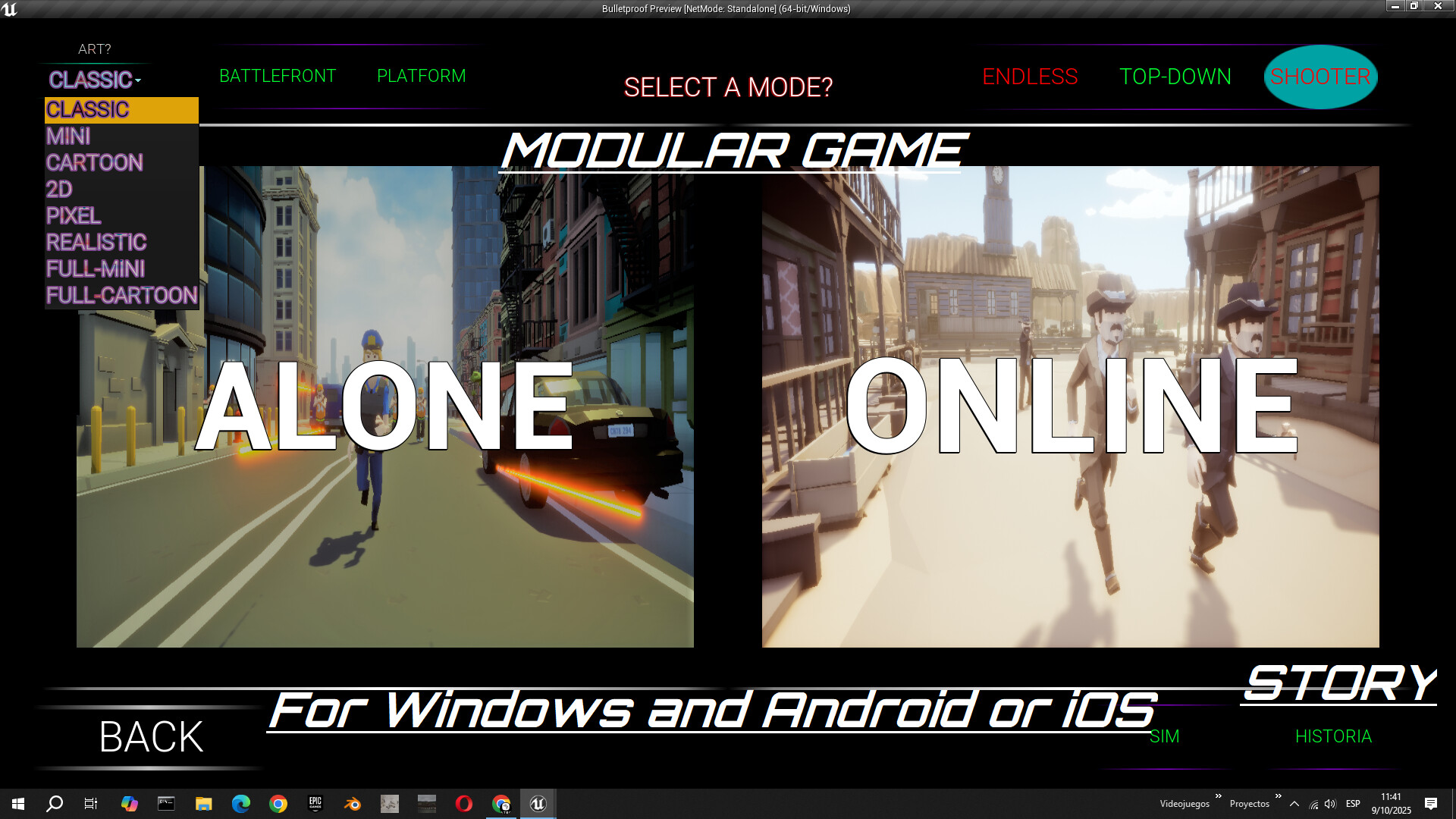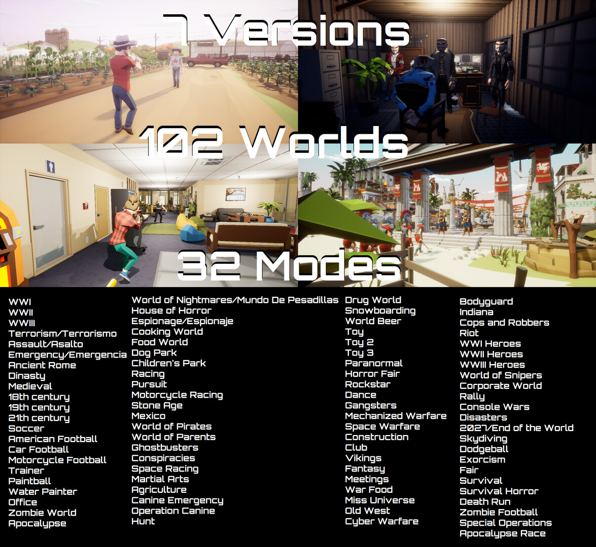 Change the art, change the history, change the rules of the game and let your imagination soar with the 250 Worlds and 50 Modes of Bulletproof... (Shooter, RTS, MMORPG, Arcade, Martial arts, Sports, Horror, Racing, War... There is no limit to fun)