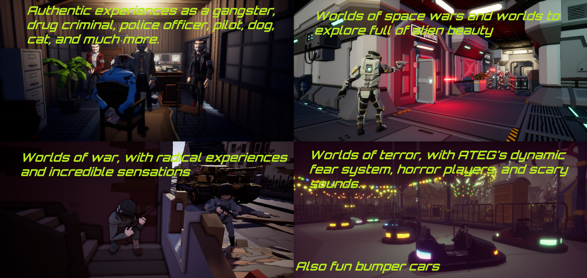 The genres of the worlds range from horror, military, social, racing, sports, fantasy, science fiction, survival, hobbies, animals, lucrative, festive, toys, and children's themes, and more. (Age Rating by Parental Control: +7 - +17)