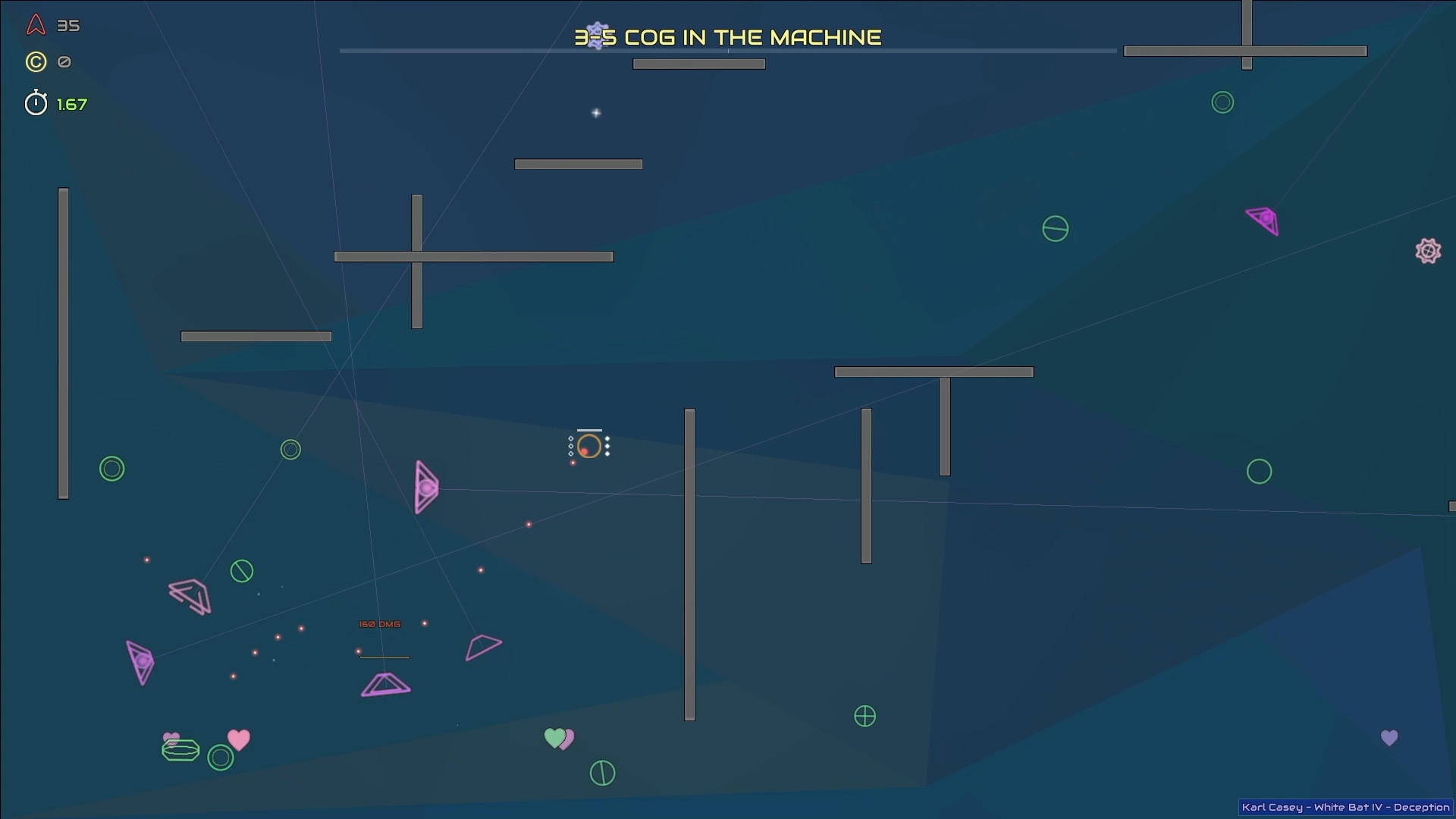 Avoid all spawning enemies and shoot them for points and credits to use as currency in the garage. Enemies may also drop buffs which are random temporary effects to help you through your journey. But watch out! They can also drop debuffs to hinder your abilities.