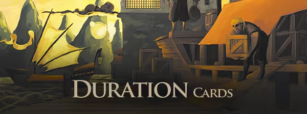 Seaside introduces duration cards. Duration cards are orange and have abilities that affect future turns. Players do not discard Duration cards in Clean-up if they have something left to do; they stay in play until the Clean-up of the last turn that they do something. Additionally, if a card such as Throne Room plays a Duration card multiple times, that card also stays in play until the player discards the Duration card.