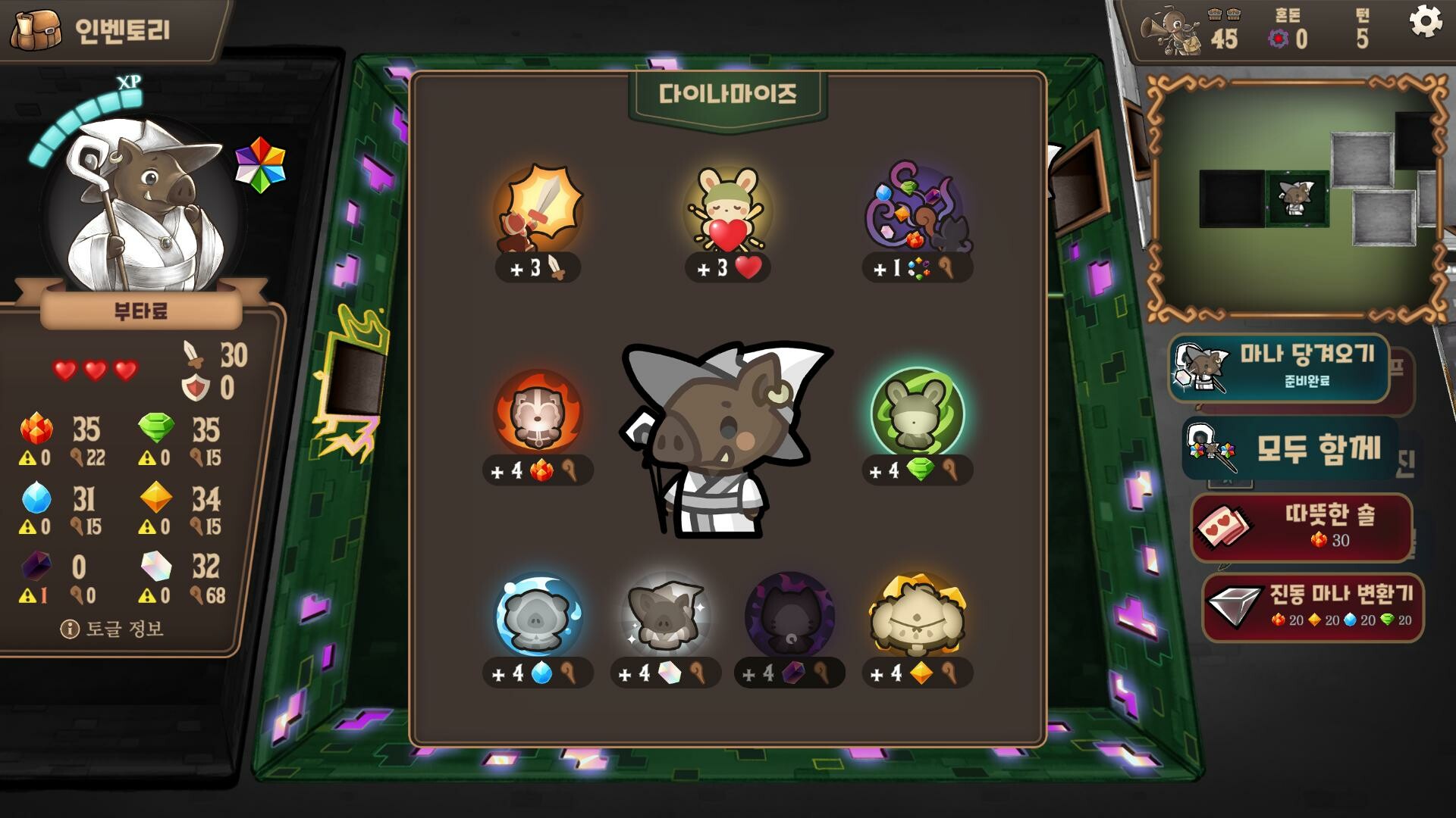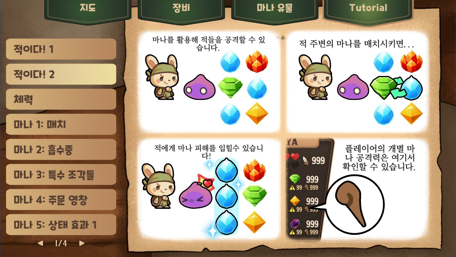 매치3 어드벤처 필드에 마나를 상징하는 블럭들이 존재하며 이들을 옮기고 서로 위치를 바꿀 수 있습니다. 마우스로 옮길 수도 있고 캐릭터를 조작하여 이동시킬 수 있는대, 마우스로 클릭 앤 드래그를 통해 옮기는 경우에는 옮긴 뒤 매칭이 되지 않으면 되돌아오는 규칙을 가지고 있죠. 캐릭터를 직접 움직일때에는 그런 규칙은 없는대, 캐릭터가 보유한 마나에 따라서 이동하였을때 매칭 처리가 되는 경우도 있습니다. 바람 마나일 경우, 이동한 위치의 상하나 좌우에 동일한 마나가 있으면 매칭이 되는 형태이죠. 기본적으로 3개의 동일한 마나를 매칭하여 제거할 수 있으며, 4개 이상도 조합이 가능합니다. 4개 이상 시, 장착한 장비에 따라서 특수한 효과가 발휘됩니다. 좌우를 제거하는 블럭이라거나 범위 폭발, 적이나 특정 대상을 향해 쏘아지는 블럭 등. 또한, 매칭된 블럭이 캐릭터를 중심으로 일정 범위 내일 경우에는 흡수할 수 있죠. 이렇게 마나들을 매칭하여 소멸시켜 마나 획득 외에 인접 영역의 적에게 대미지를 줄수도 있습니다. 이때, 매칭한 마나에 따라서 화상이나 기절 등의 상태이상을 발생시키기도 하죠. 단, 몬스터에 따라서 대미지를 입지 않고 오히려 회복을 하는 경우도 있습니다. 해당 몬스터가 어떤 속성에 약점을 가지고 어떤 속성에 회복하는지 파악한 뒤 실수로 회복시키지 않도록 조심하여야 하죠. 마나 매칭 외에도 직접 공격을 하거나 스킬을 통해 대미지를 줄 수도 있습니다. 직접 공격은 인접한 영역에 위치한 적만 대미지를 줄 수 있는대, 한 번에 처치하지 못하면 역으로 공격을 당하니 활용하기에 그리 좋지는 않습니다. 스킬의 경우에는 보유한 아이템으로 발동을 하며 매칭으로 흡수한 마나 중 특정 속성의 마나들을 요구합니다. 해당 마나를 가지고 있으면 발동이 가능하며 직접 대미지를 주는 스킬도 있고, 특정 마나 수집이나 시간 정지, 무적 등의 다양한 효과의 스킬들이 존재하죠. 아이템에는 보유 효과들도 존재하며, 일부는 이 보유 효과만 존재하는 경우도 존재합니다. 아이템은 특정 수의 슬롯을 차지하며, 슬롯이 부족하다면 아이템을 버리면서 마나를 획득한다거나 스킬만 추출하여 스킬 슬롯에 배치할 수 있습니다. 참고로, 아이템은 황금 찬장이 있는 방을 클리어하였을때 또는 층 클리어 후 중간 지점에서 마나들을 소모하여 생성 및 획득이 가능하죠. 그렇게 매칭도 하고 스킬도 쓰면서 방을 클리어하고 나아가야 합니다. 방의 클리어 조건을 조금씩 다른대, 일정 수의 인장을 드러내게 하거나 보주 제거, 지정된 마나 매칭, 모든 적 처치 등이 존재하죠. 방의 벽 중 랜덤한 곳에 검은 포탈이 존재하며 방의 목표를 수행하면서 진행되는 턴에 따라 포탈 수치가 줄어들고 0이 되면 몬스터가 등장하게 됩니다. 목표를 수행하고도 귀찮게 싸우는 것이 싫다면 최대한 빠르게 수행을 하는 것이 좋죠. 또한, 일정 턴마다 혼돈이 추가되어 드랍되고 이 혼돈이 캐릭터와 인접한 곳에서 매칭되면 대미지를 입게 되기에 턴을 최대한 적게 소모하면서 나아갈 수 있도록 해야합니다. 그렇게 방을 이동하다보면 뭔가 화려한 문을 만날 수 있습니다. 황금색의 방이라면 여러개의 아이템이 들어있는 황금방이며 강력한 적을 처치하면 진입해 수집이 가능합니다. 그런 문이 아니라면 보스룸으로 향하는 문입니다. 보스들은 높은 체력과 특정한 패턴의 공격 능력을 가지고 있으며 그만큼 상대하기가 상당히 귀찮습니다. 어느정도 아이템이 갖추어진 상태라면 빠르게 결판을 낼 수도 있지만, 상대하기에 그리 효율적이지 않다면 생각보다 시간을 잡아먹힐 수도 있죠. 보스를 처치하면 다음 층으로 향하는 계단이 등장하며 최초로 처치한 적이면 특별한 장비가 언락되기도 합니다. 층을 내려가면 중간 지점으로 여기서 개미와 아이템 수정을 만날 수 있습니다. 개미를 통해서는 스킬로 만든 아이템을 되돌릴 수 있고, 수정을 통해서는 요구하는 속성의 마나를 소모하여 아이템을 생성할 수 있죠. 그거말고는 딱히 보상은 없기에 딱히 얻는 것 없이 그냥 지나치기도 합니다. 최소한 체력이라도 만땅으로 채워주던가.... 그렇게 층을 이동하고 스토리도 진행하고 헤어진 동료도 만나고 보스들도 만나면서 모험을 합니다. 특정 동료를 찾아서 다음 모험부터 해당 동료로 플레이할 수도 있고, 동료가 제작된 아이템을 가지고 시작할 수도 있죠. 또한, 특정 방으로 즉시 이동하는 기능도 언락되어 이용 가능해집니다. 하지만... 뭔가 재미는 있는거 같은대... 회복이 너무 짠 느낌도 있고 보상도 뭔가 시원찮고... 밸런스도 특정 지점에서 무너지는 느낌도 있고.... 아쉬운 점 -번역이 뭔가 알아들을 듯 하면서 뭔소린지 모르겠는 경우가 있음 -첫번째 방에 몬스터만 10여마리가 있는건 선넘는거 아녀....? -방 클리어 시, 맵 여기저기에 남은 특수 블럭들에 대한 보상이 없으니 아쉬움(마나로 얻는다거나 터지면서 조금이나마 회수가 된다거나 그런게 없음) -맵 즉시 이동을 왜 지도에서는 못 쓰고 반드시 특정 키로 오픈한 지도에서만 가능한지 의문 -설명 부족 (해당 맵이 어떠한 특성을 가지는지, 해당 몬스터