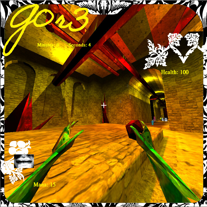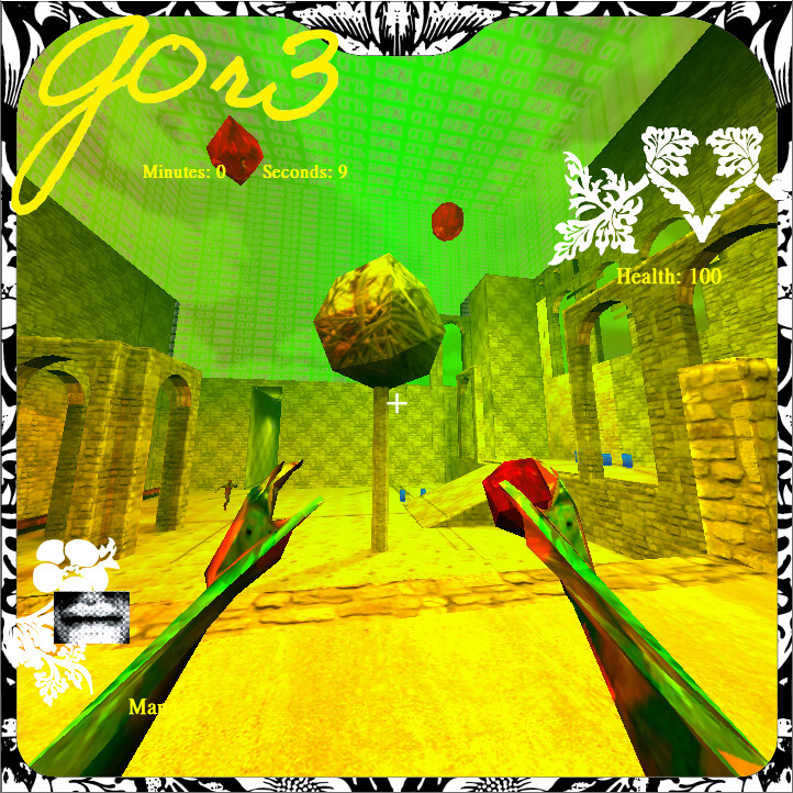 GOR3 is an abstract first-person shooter. You are an arcane warrior sent in to liberate a castle. Fight your way through multiple levels of chaos finding powerups and dealing with challenging enemies.
