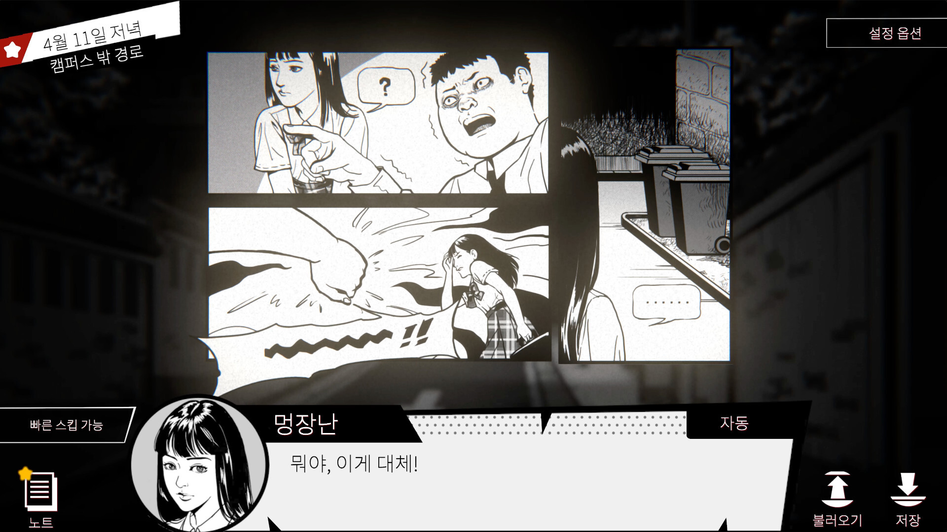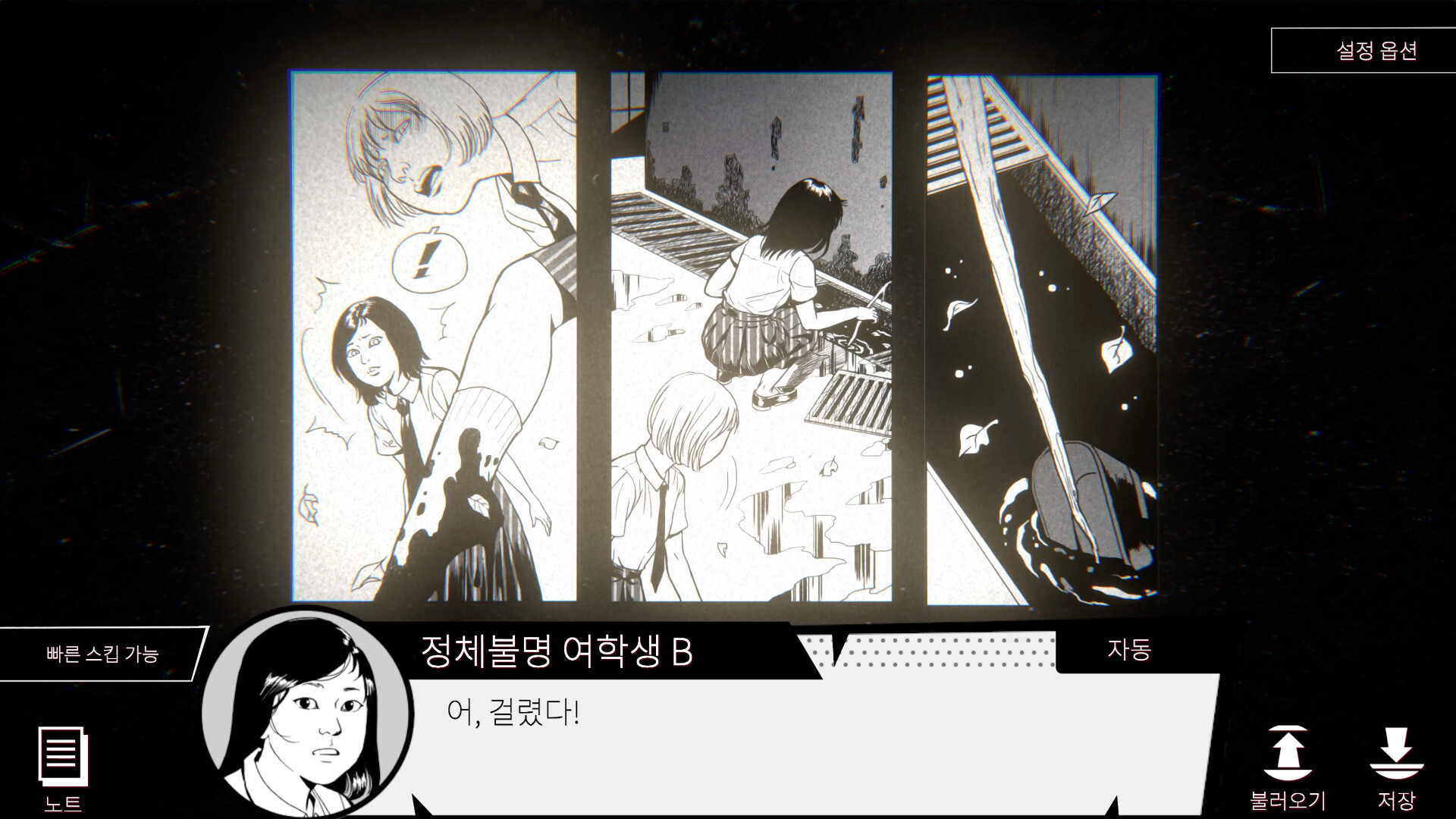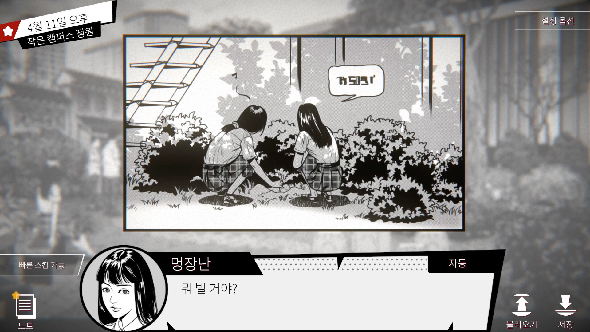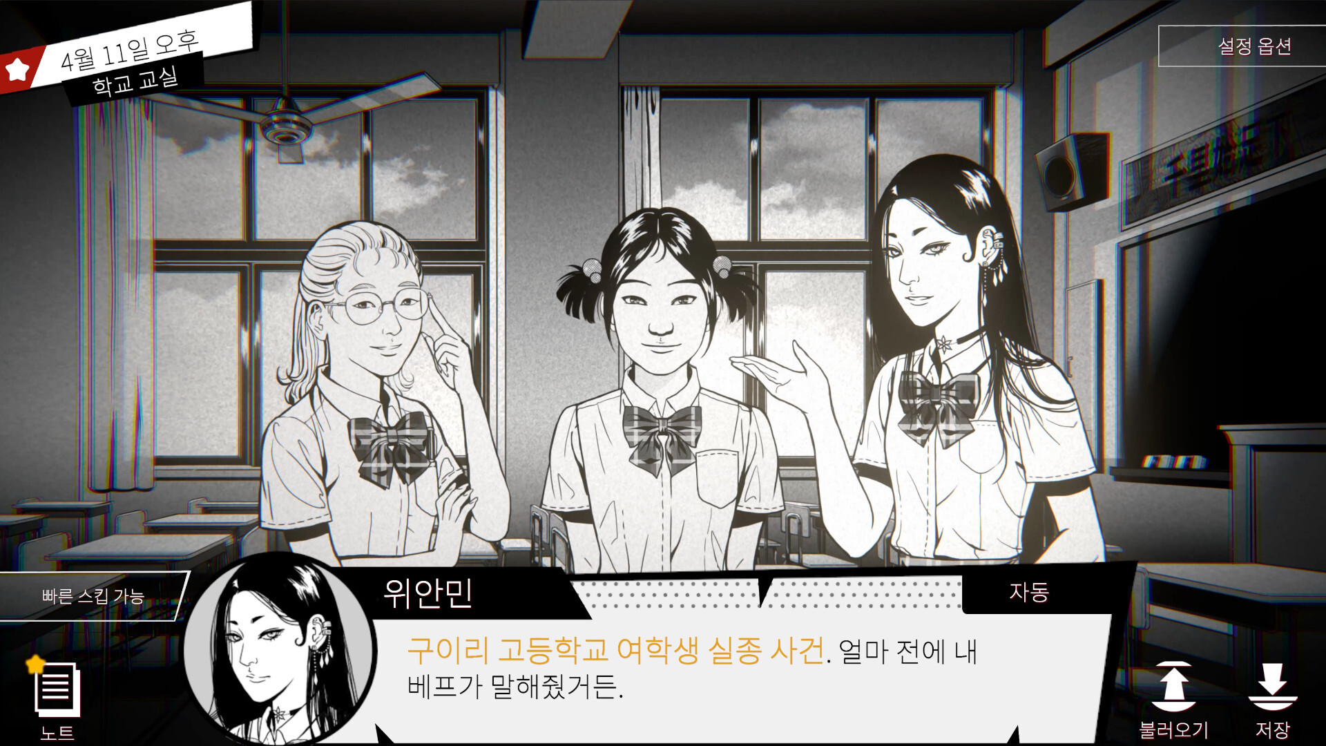 명문 고등학교에 다니는 한 여학생의 실종, 그리고 이 뒤에 일어나는 크고 작은 사건들 뒤 진실을 밝혀 나가는 이야기. Concealed 는 전작인 Ghost in the Pool 처럼 해당 게임의 원작 만화에서 따 온 이야기를 담고 있으며, 전체적으로 한 고등학교 내 일어나는 사건들 및 여기에 관련되는 괴담 및 작은 이야깃거리들을 담고 있다. 스토리의 서론을 간략하게 적자면 다음과 같다. 게임의 주인공 Meng Jiang’Nan 은 8달동안 영국에 교환학생으로 지내고 온 후 다시 자신이 다니던 학교로 돌아온 여학생이며, 같은 반 안에 아무도 아는 학생이 없지만 인싸라 그런가 며칠 만에 친구들을 쉽게 만들고, 담력도 평균 이상이라 허구한 날 기이한 현상들 및 괴담에 대해 이야기를 나누는 여고생 그룹과도 친해지게 된다. 학교생활을 시작한 지 며칠이 지나고 같은 반의 다른 여고생 Han Qi 가 실종되면서 학생들 간 큰 화젯거리가 되는데, 이 사건에서부터 시작해 주인공 및 친구들이 Han Qi 의 실종과 이와 관련된 다른 사건들의 진상을 추리해 나가는 만담, 그리고 결말에서 진상이 밝혀지는 게 이 게임의 주요 스토리이다. 전작의 이름을 보면 알겠지만, 그 게임의 장점이었던 흑백 만화 스타일의 비주얼과 깔끔한 그림체를 가져와서, 시각적 면에서는 불만이었던 점이 없었다. 또한, Ghost in the Pool 와 같은 고등학교에서 일어나는 스토리여서, 그 게임의 주인공 및 스토리가 여기에서 언급이 되고, 혹시나 그 게임을 할 거면 – 별로 추천하는 게임은 아니더라도 – 이 게임을 시작하기 전에 하는 걸 권장한다. 그러면, Concealed 는 Ghost in the Pool 의 비주얼은 계승하는 것 말고, 어떠한 점에서 비슷하거나 달라졌을까? 1. 분량이 굉장히 길어진 스토리, 그리고 이 때문에 스토리가 “예열 되는” 시간이 길지만 전체적으로는 나쁘지 않은 이야기였다. Concealed 의 1회차 분량은 약 10시간 정도로, 가격 자체는 Ghost in the Pool 의 약 3배의 가격이지만 플레이타임은 20배 정도 불어난 분량을 자랑한다. 게임플레이가 딱히 바뀐 것은 아닌데 – 텍스트의 벽 사이 선택지가 중간중간 나오면서, 학교 안 학생들과 상호작용을 하며 대화하는 시간 / 오후에 주인공이 어디로 가서 자유시간을 보낼지 선택하는 시간이 섞여 있다 – 전작에 보였던 스토리를 늘어지게 만드는 요소들에 대해 괜찮은 개선점들을 넣어 두어서, 전작처럼 게임 진행에 스트레스를 크게 받지는 않았다. 이 개선점들이 무엇인가? 먼저, 전작에는 특정 장소 안 사물들을 일일이 클릭해 가며 별 쓰잘데기 없는 상호작용들을 보았어야 했지만, 이번 작에서는 상호작용을 하는 대상들이 대부분은 같은 반의 학생들만 클릭해서 대화를 하는 부분이며, 알맹이 없던 전작의 상호작용과는 다르게 이번 작에서는 그래도 학생들 개인에 대해 설명 및 게임의 세계관 설립에 도움이 되는 방향으로 대사들이 나와서, 쥐뿔도 필요 없는 내용이라고 생각되지는 않았다. 다른 개선점으로는 상호작용의 수를 대폭 줄였다는 점인데, 물론 분량이 분량인지라 학생들과 대화하는 구간이 적지는 않지만, 플레이타임에 비해서는 전작보다 꽤 적은 수로 존재하며, 스토리의 흐름을 끊어 먹을 정도로 범람하지는 않기 때문에 이러한 구간들이 피곤하게 느껴지지 않았다. 게임플레이의 개선점은 여기까지 이야기하고, 스토리 자체의 경우는 분량이 분량인지라 초반에 지루하게 느껴질 수 있지만 – 실제로, 게임 내 주요 사건이 일어나는 건 3챕터의 마지막이 되어서야 큰 사건이 하나 터지고, 이 전에는 스토리의 긴박함이 크게 느껴지지 않는다 – 그래도 흐름 자체는 괜찮았고, 마무리의 경우도 게임 내 뿌려 두었던 떡밥들을 거의 모두 회수하는 방향으로 결말이 났기 때문에 찝찝하게 느껴지지 않았다. Ghost in the Pool 처럼 어느 정도 초자연적 요소가 나오기도 하고, 만약 나처럼 상상력이 너무 풍부한 사람이거나 눈치가 빠르다면 마지막 챕터에서 진상이 밝혀지기 전에 스토리의 진실을 모두 예측할 수 있을 정도라 그렇게까지 불친절한 스토리텔링을 보여주지는 않는다. 또한, 게임 내 다양한 선택지를 보고 깊이 있는 멀티 엔딩을 기대할 수 있지만, 이 게임에서 선택지는 답이 정해져 있거나 하나의 길로 귀결되는 선택지가 대부분이라 – 후자의 경우, 주로 오후에 어디서 자유시간을 보낼지 선택하는 길이 여러 갈래이지만, 소소한 대화들을 엿듣는 선택의 차이에 그치고 메인 스토리에 큰 영향을 주지 않는 선택지들을 의미한다 – 대놓고 말해서 게임의 마지막 즈음에 나오는 선택지 하나만이 엔딩 분기에 큰 영향을 미친다. 좋게 보면 모든 엔딩을 보기 편한 것이고, 나쁘게 보면 선택지의 다양성이 그리 큰 게임은 아니지만, 그래도 비주얼 노벨의 중심인 흥미로운 스토리 전달을 잘 해낸 게임이라 이러한 점이 크게 부정적으로 느껴지지는 않았다. 2. 전작의 단점인 “텍스트 스킵의 부재” 는 그대로 가져옴. >>>> 이후 업데이트로 개선됨 !! (맨 하단 참조) 게임플레이 자체는 전체적으로 나아졌지만, 비주얼 노벨의 감초와도 같은 텍스트 스킵은 아직도 지원하지 않는다. 물론 위에서도 적었듯이 “어짜피 엔딩은 마