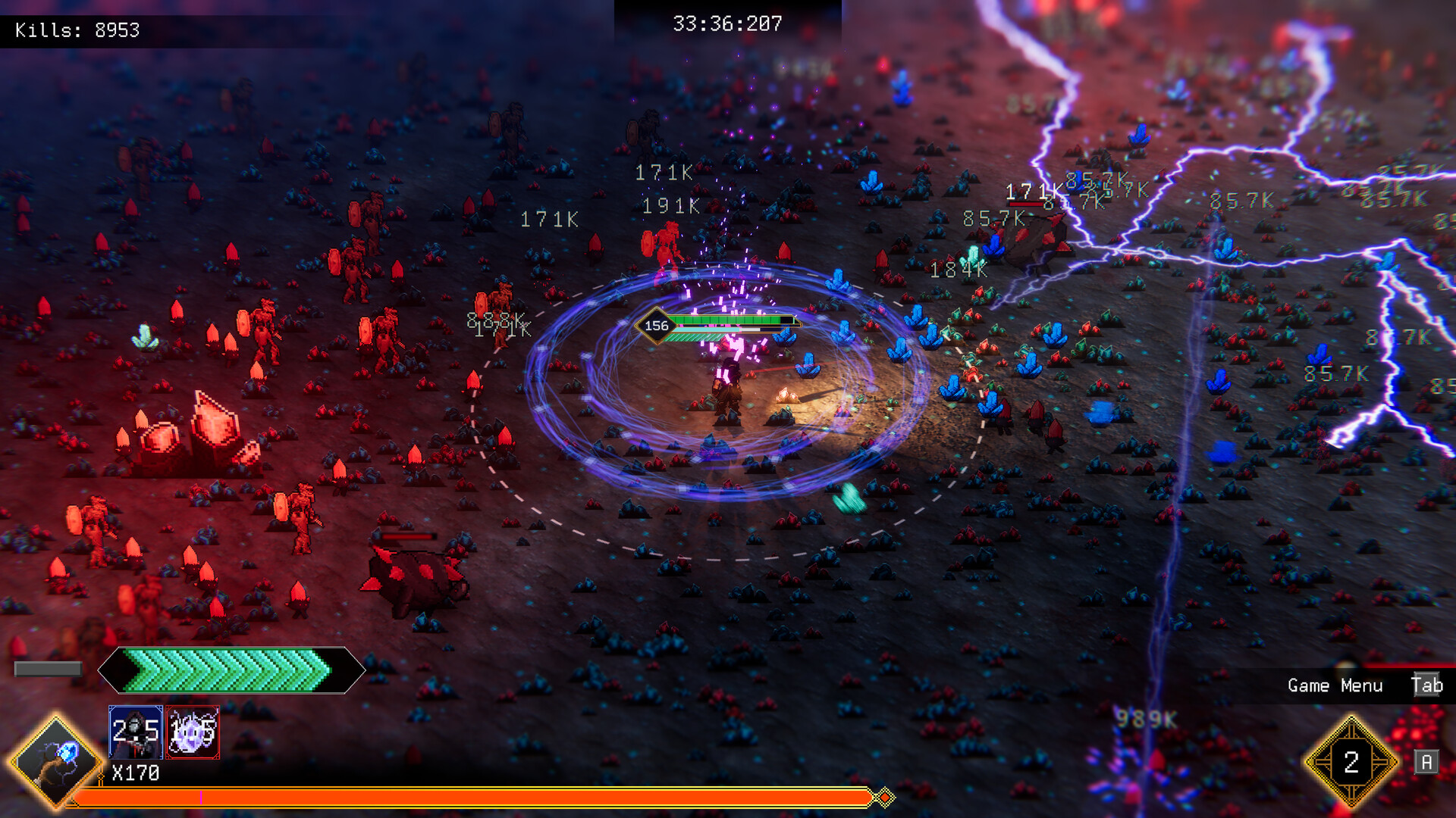 뱀서류 게임이나.. 1초에 수백번을 공격하느라 렉이 걸릴 정도로 화려합니다. 엄청난 뽕맛을 보여주지만, 상당히 고사양 게임입니다. ( GeForce RTX 2080 Ti 기준, 중후반 스테이지는 GPU 상시 로드율 90% 이상) ------------------------- 장점 : -엄청난 공격 횟수, 공격 범위, 이펙트로 차오르는 뽕맛 -뒤로 갈수록 엄청나게 강력해짐 -70시간 가까이 해금하는 컨텐츠 분량 단점 : -엄청난 GPU 몰빵 게임(그래픽 카드 부하가 걱정됨) -초반에 밋밋하게 느껴질 수 있음 -지루한 반복으로 느껴질 수 있음 ------------------------- 매 스테이지마다 사방에서 몰려오는 적들을 일정량 이상 처치하거나, 제한 시간동안 생존하면 됩니다. 스테이지 선택에 따라 전투가 아닌 이벤트, 상점 스테이지도 있습니다. 아래와 같은 성장 요소가 있습니다. 1. 영구적인 캐릭터 스텟 상승 2. 특정 무기를 선택하고 강화하는 액티브 스킬과 부가효과를 주는 패시브 스킬 3. 해금에 따라 얻을 수 있는 강력한 카드와 무기 진화 4. 다른 플레이 방식을 지닌 캐릭터 무기 진화가 없어도 진행은 되지만 진화한 무기가 주는 뽕맛을 잊을 수가 없습니다. 무기 카드는 대부분 7레벨이 만렙입니다. 무기 진화를 해금하기 위해서는 무기 카드를 8레벨까지 찍어야 합니다. 1. 무기 카드를 6레벨만 찍어놓는다. (예시 : 대검) 2. 상점이나 대장간에 들렸을 때 대검 카드를 판매하고 있다면 3. 카드 선택을 구매(대검 말고 랜덤 선택)하고 리롤을 동원해서 대검 카드를 찾는다. 4. 성공적으로 대검 카드를 찾았다면 현재 7렙이고, 이 상태에서 구매하지 않았던 대검 카드를 구매한다. 5. 8레벨 완성 혹은 한계 초월을 이용하는 방법도 있습니다. 한계 초월이란 보유중인 카드가 만렙일 때 낮은 확률로 상점과 대장간에서 등장합니다. 따라서 무기 카드를 이미 7레벨을 만들었다면, 한계 초월을 이용해야만 8레벨이 될 수 있습니다. 그리고 무기 카드 9레벨을 찍을 수도 있는데요 9레벨을 찍으면 대부분의 무기는 매우매우매우 강력해집니다. 이를 위해서는 원하는 무기 카드와 한계 초월을 상점 및 대장간에서 팔고 있어야 합니다. 0. 무기 예시 : 대검 1. 대검 6렙을 미리 찍어 놓는다. 2. 상점에서 대검 카드와 한계 초월을 판매하고 있다면? 3. 카드 선택을 먼저 구매해서 7렙을 찍는다 4. 한계 초월로 8레벨 5. 마지막으로 대검 카드를 구매하면 9레벨 이외에도 타락을 이용하여 적의 스펙을 수만배 늘릴 수도 있습니다. 현재 0.9.0.1 버전이지만 곧 업데이트를 통해 여러가지 개선한다고 하네요. (UI, 5번째 존, 새로운 무기 진화 등등) 기대되는 게임입니다.