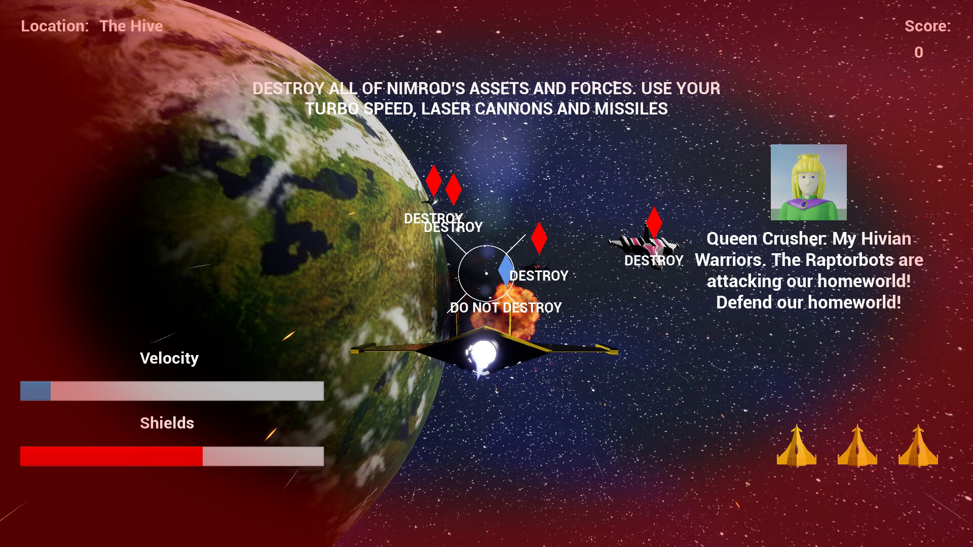 You are Paladin, a heroic starfighter pilot who flies the legendary Griffin Starfighter. You are from a fictitious exoplanet called The Hive which is located light-years away from the Earth. The evil King Nimrod and his forces from an undisclosed exoplanet in a galaxy somewhere in the universe are conquering the universe. The leader of The Hive, Queen Crusher, opposes King Nimrod. You and your Radar-Intercept Officer code named Wizard now have to fly in the Griffin Starfighter and restore peace in the universe by vanquishing King Nimrod, all of his forces and all of his assets wherever they may be. The despicable King Nimrod and his forces are mechanical extra-terrestrial (E.T.) lifeforms known as the Raptorbots, while you (Paladin), Wizard and Queen Crusher are insectlike extra-terrestrial (E.T.) lifeforms known as the Hivians.