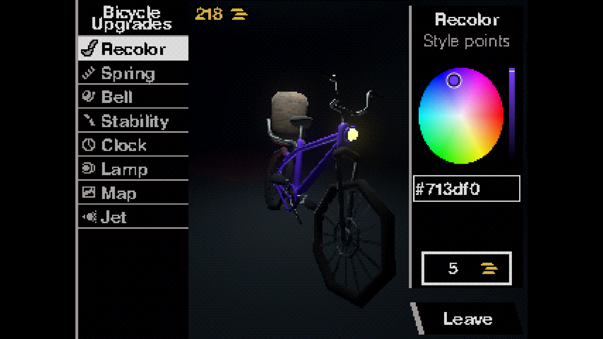 We have given you a bicycle to aid you in your delivery tasks, it's quite sturdy and can go pretty fast. However, there is still room for improvement. The local bicycle shop will be able to pimp up your bicycle to your liking, from styling it to turbo boosters, they have it all. Just make sure you have the funds to afford it all.