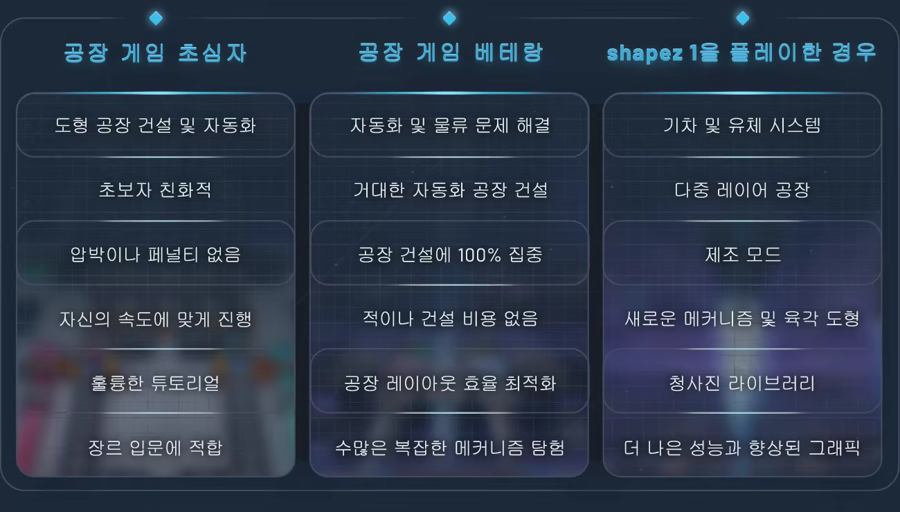 공장으로 보다 어려운 게임임 공장 설계할 때 3D로 설계해야 한다는 점이 이 게임을 더욱 어렵게 하는 거 같음 공장으로 웬만한 공장 설계하는 거보다 어렵다고 느낌 창고 시스템이 없어서 공정설계를 비율에 맞춰서 설계해야 하고 그마저도 어려우면 회로로 물류량을 조절해야함 그래서 병목이 제일 큰 문제점인 거 같음 하지만 이러한 점을 해결하고 도형을 만드는 걸 모두 모듈화하면 쉽게 공장을 늘려나갈 수 있음 공장 게임 좋아하고 뭔가 강박증이 있다고 하는 사람들은 이게임으로 성불할 수 있을 듯 난 없어서 천천히 하려고