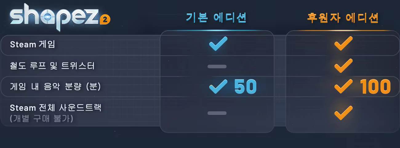 중요 참고 사항: 후원자 에디션을 구매하면, 그 무엇보다도 shapez 2에 대한 지지를 표명하게 됩니다. 철도 장식과 추가 음악 트랙은 덤으로 드리는 선물입니다!