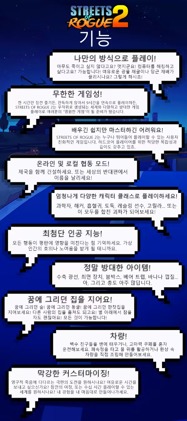 Streets of Rogue 2는 모든 것이 가능한 예측불허의 살아있는 오픈월드로 여러분을 초대합니다. 혼자서, 혹은 친구와 팀으로 타락한 대통령을 쓰러뜨리는 정신나간 모험을 떠나보세요. 원하는 방법으로요! Rimworld, Valheim, Stardew Valley, Kenshi, Terraria, Dwarf Fortress 같이 자유를 중점으로 한 스토리 생성 샌드박스 게임을 좋아한다면 Street of Rogue 2는 여러분에게 딱 맞는 게임입니다. 매력적이고, 타협 없는 시스템 주도식 경험으로 플레이어들은 수없이 많은 재밌는 방식으로 세상과 상호작용 가능합니다.