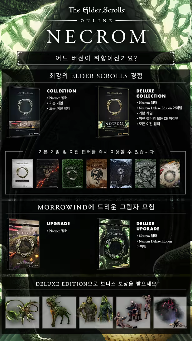 The Elder Scrolls Online Collection: Necrom 및 The Elder Scrolls Online Deluxe Collection: Necrom에는 기본 게임, Necrom, 모든 이전 챕터(High Isle, Blackwood, Greymoor, Elsweyr, Summerset,Morrowind)가 포함되어 있습니다. Deluxe Collection: Necrom 구매자에게는 Deluxe 게임 내 아이템이 증정됩니다. 컬렉션 에디션 구매자는 바로 기본 게임이나 Necrom, 혹은 이전 챕터에 뛰어들어 즐길 수 있습니다.