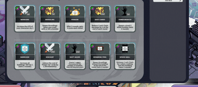 게임 도중 카드를 사용하여 캐릭터에게 특별한 능력을 부여하거나 필요한 것을 보충하고(예를들어 힐), 기지의 내구도를 강화하세요. 게임 전 메인 메뉴에서 카드 덱을 수정할 수 있으며, 다양한 카드를 추가하거나 제거하여 최상의 능력과 업그레이드 조합을 만드세요. 덱을 현명하게 선택하세요, 그것이 게임 결과를 결정할 수도 있습니다.