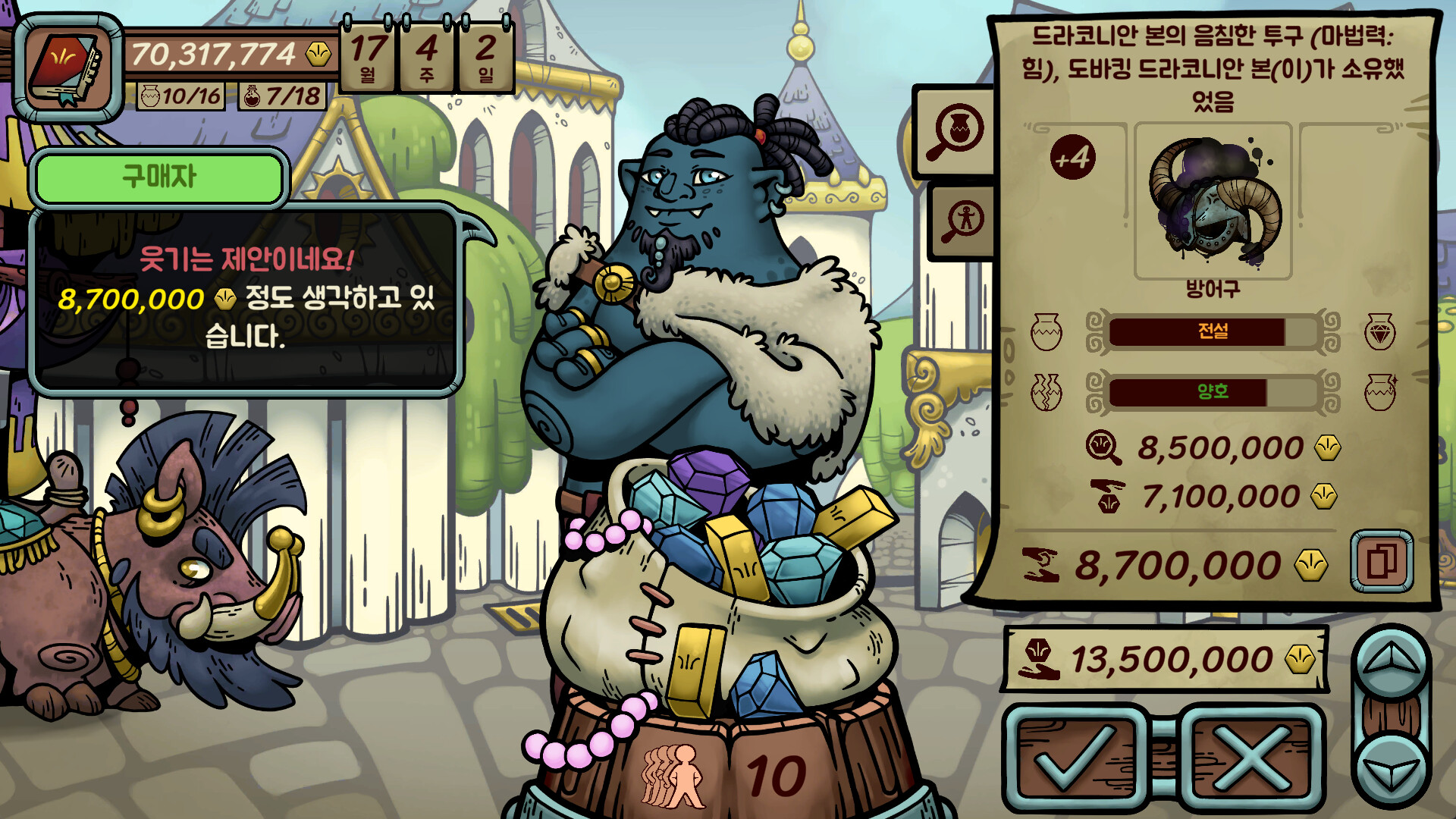 또한 직원을 통해 거래 마법 물약도 제조할 수 있습니다. 이러한 특별 마법 물약은 퀘스트를 통해 얻을 수도 있으며, 물약을 통해 스킬을 강화해 협상을 유리하게 진행할 수도 있으며, 손님의 마음을 바꿀 수도 있답니다. 합법적인지는 모르겠지만 버프 효과만은 정말 확실하답니다.