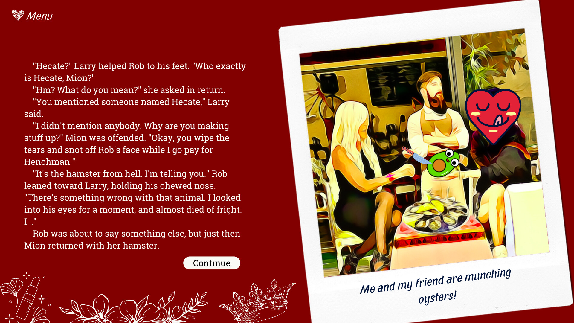 If you are a fan of Eva Morozova, Eugène Ionesco, or Daniil Kharms, this game will surely delight you, outrage you, outeat you, and outshi... Ahem. Let's not talk about that yet.