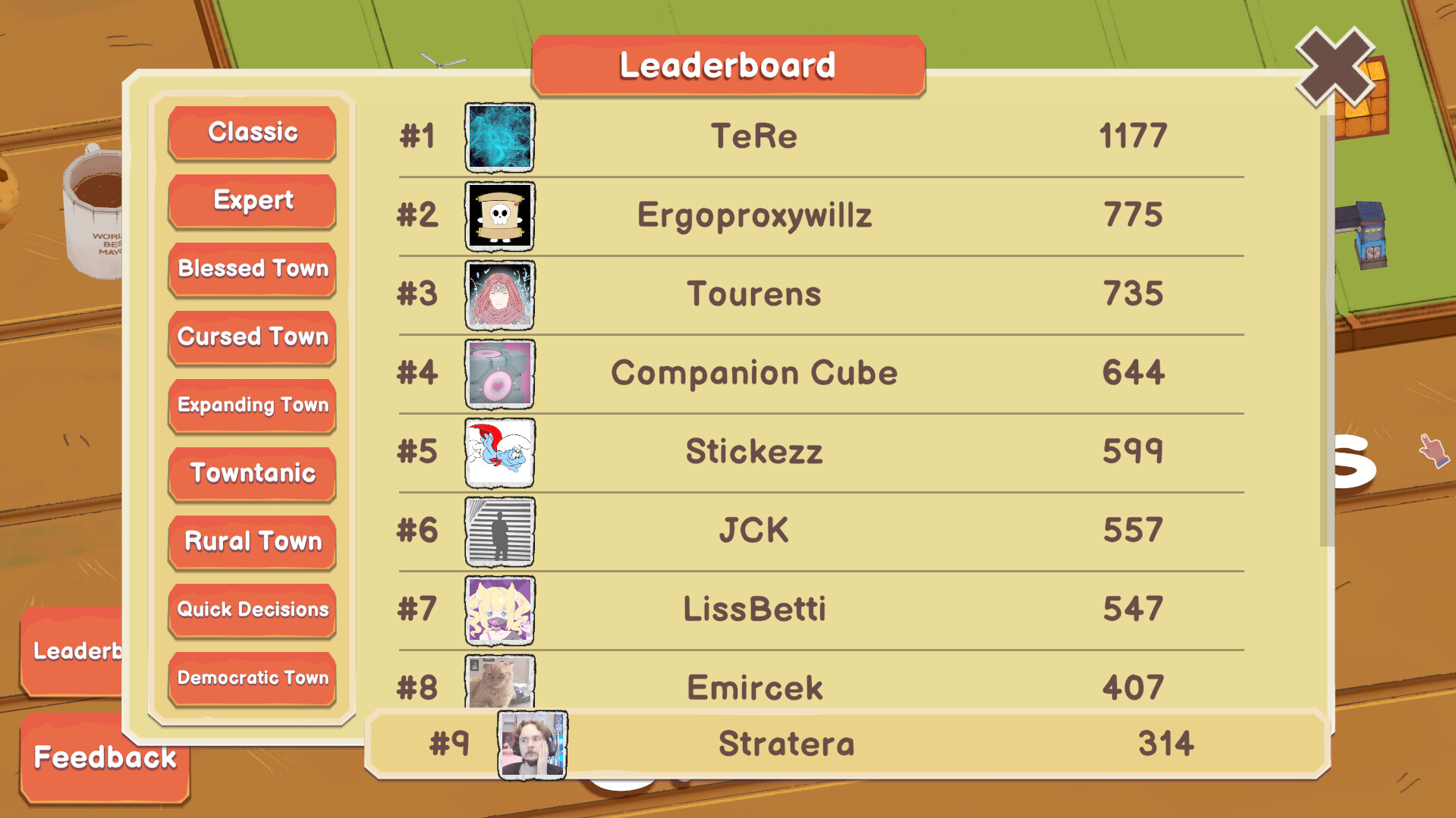 시장버튼 누를때마다 건물 가격-1되는 특성 / 시장버튼이 국가지원으로 변경되는 특성에 기타 사소한 특성들이 잘 맞아들어가면 네가지 자원이 평균 100까지 올라가는 기적을 볼 수 있음. 빨간카드 사용하면 트러블카운터 초기화되는 특성도 위 특성들에 조합되니까 개사기라서 공무원 남아돌았음. 그때부터는 특성을 관광, 교육에 투자하는게 좋음. 그리고 철거 카드 꼭 지켜야됨. 나오기는 초반에 나오는 카드인데 후반 갈수록 필요해짐. 그리고 후반 노려볼만한 조합이 나왔다면 면적당 인구수가 적은 건물들은 만들지 않는게 나은거 같음.