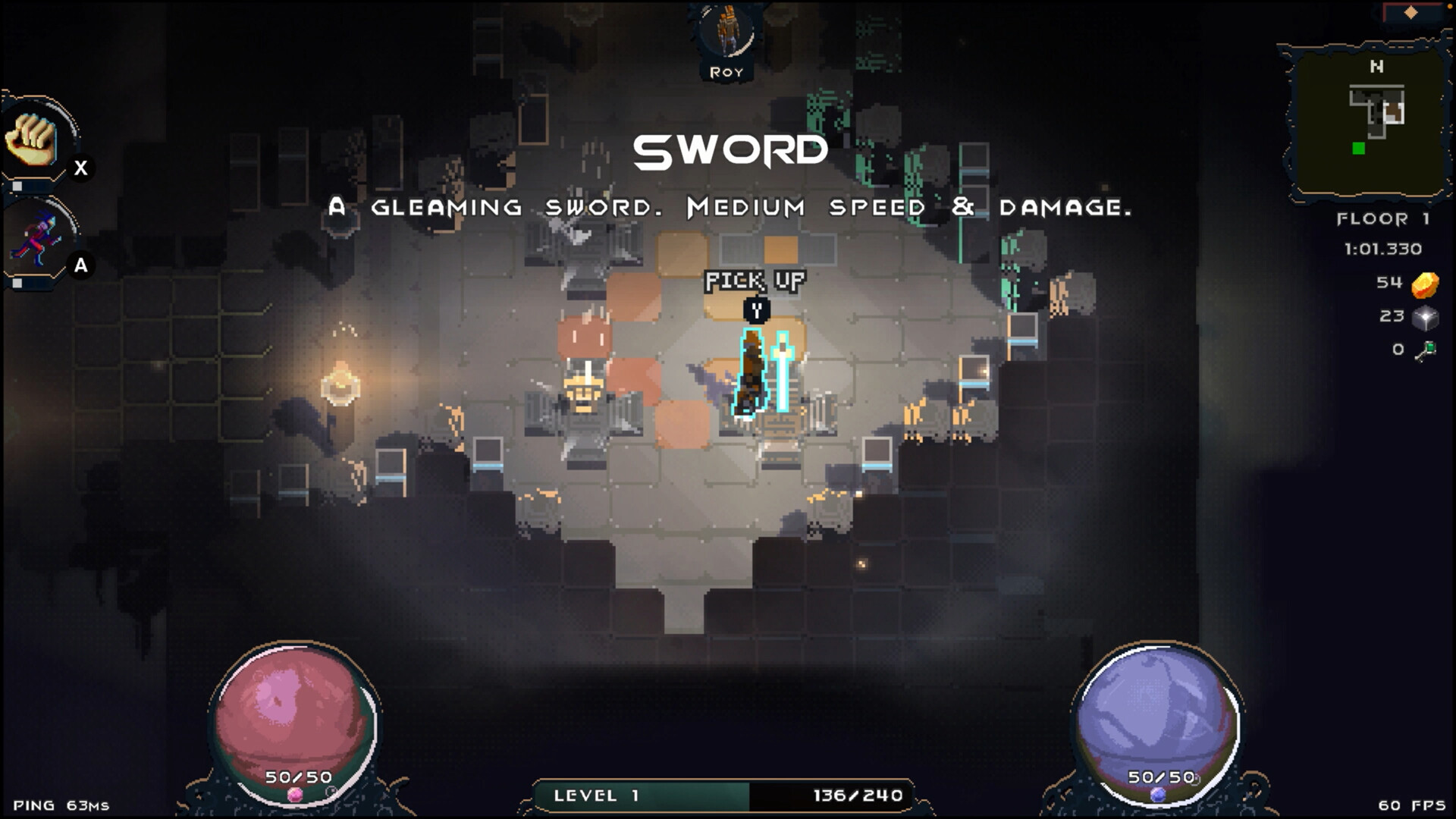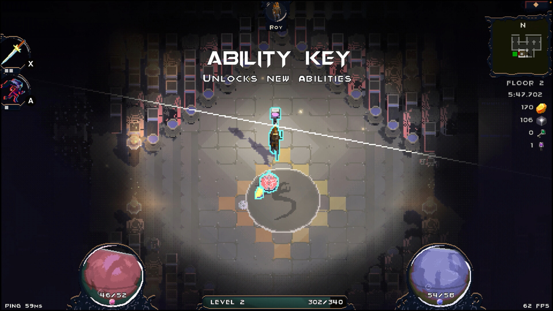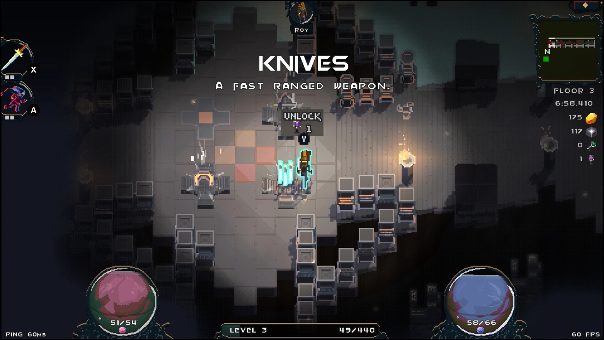 Each run you play through a randomly-generated dungeon crawl while building a new sequence of weapons and abilities. When you discover a new ability you get to choose between multiple, allowing you to craft your experience. New abilities will unlock previously inaccessible areas in a Metroidvania-like fashion.