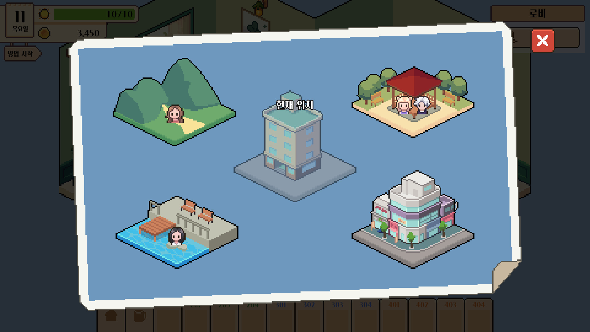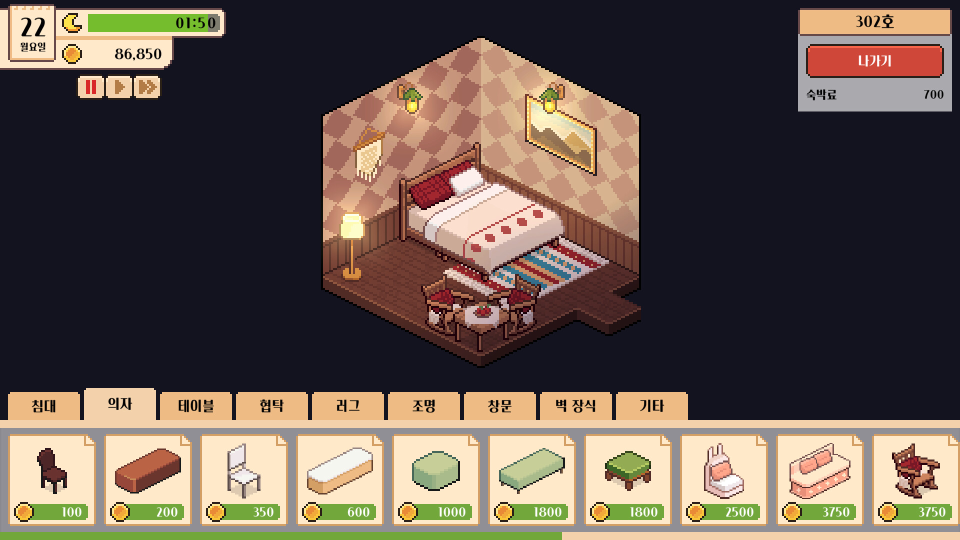 가구를 구매해 로비와 객실을 꾸미세요. 호텔을 가꿀수록 더 많은 손님이 찾아옵니다.